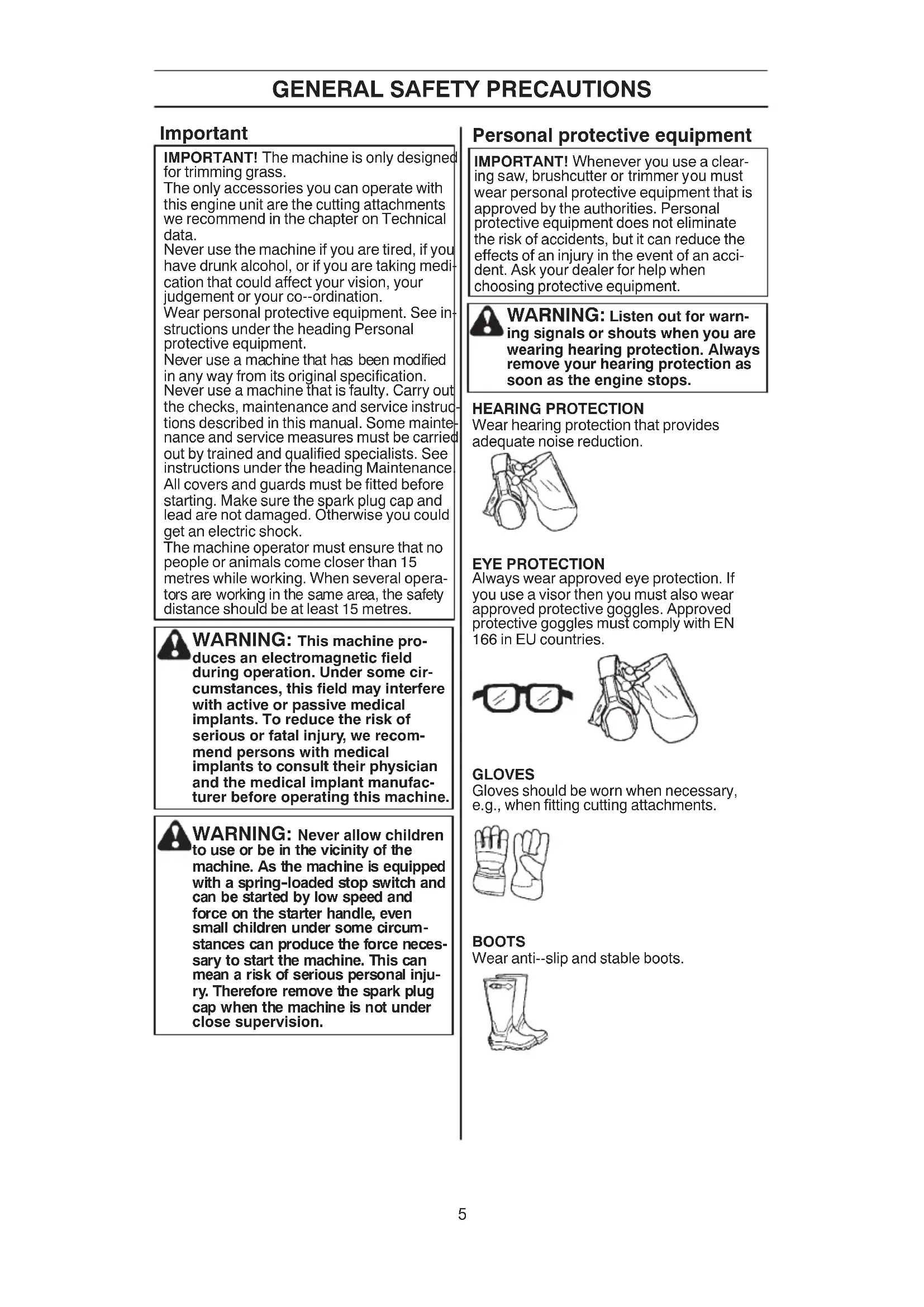 IMPORTANT! Whenever you use a clear- ing saw, brushcutter or trimmer you must wear personal protective equipment that is approved by the authorities. Personal protective equipment does not eliminate the risk of accidents, but it can reduce the effects of an injury in the event of an acci- dent. Ask your dealer for help when choosing protective equipment. HEARING PROTECTION Wear hearing protection that provides adequate noise reduction. EYE PROTECTION Always wear approved eye protection. If you use a visor then you must also wear approved protective goggles. Approved protective goggles must comply with EN 166 in EU countries. GLOVES Gloves should be worn when necessary, e.g., when fitting cutting attachments. BOOTS Wear anti--slip and stable boots. Personal protective equipment