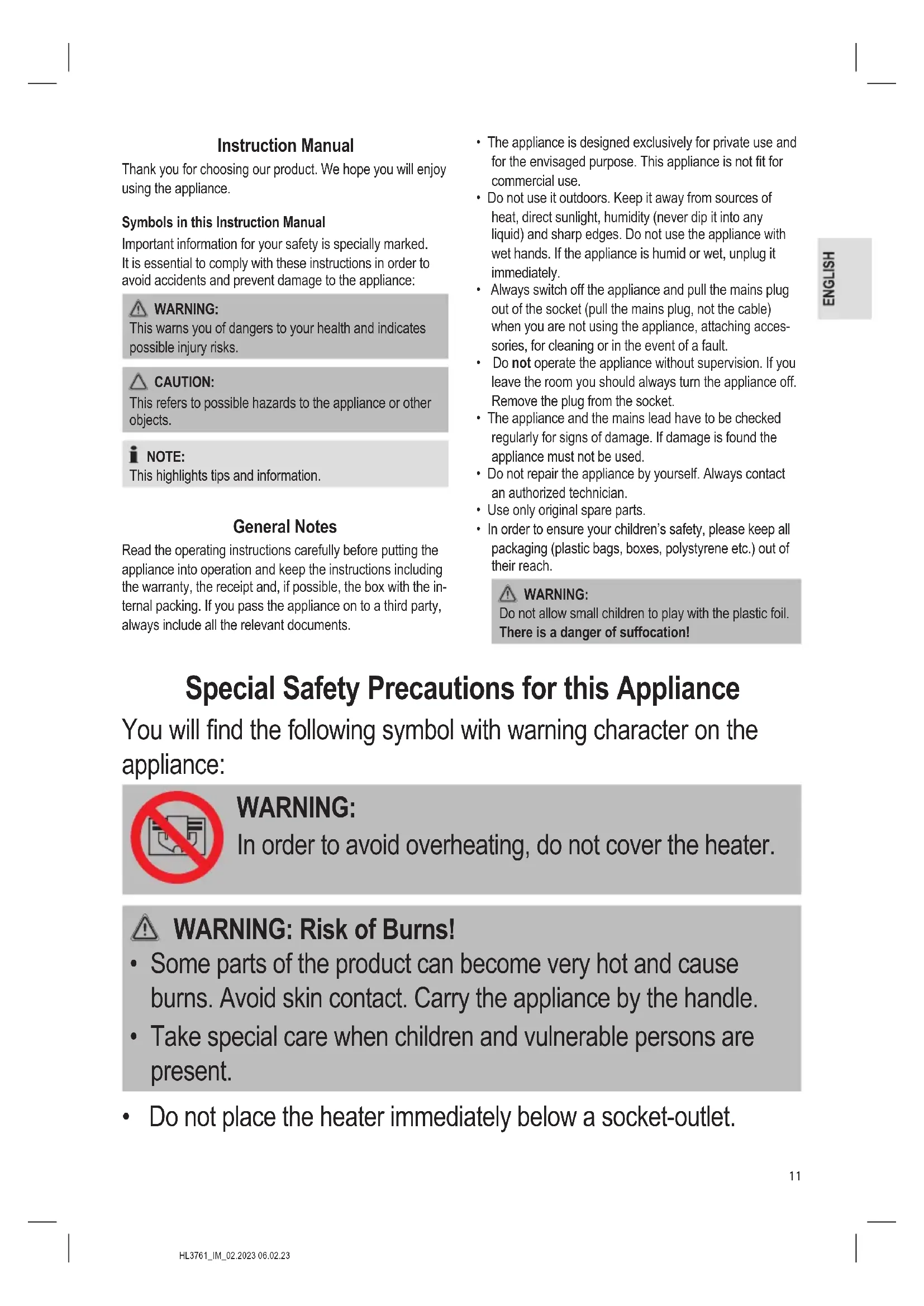 - Do not place the heater immediately below a socket-outlet.HL3761_IM_02.2023 06.02.23