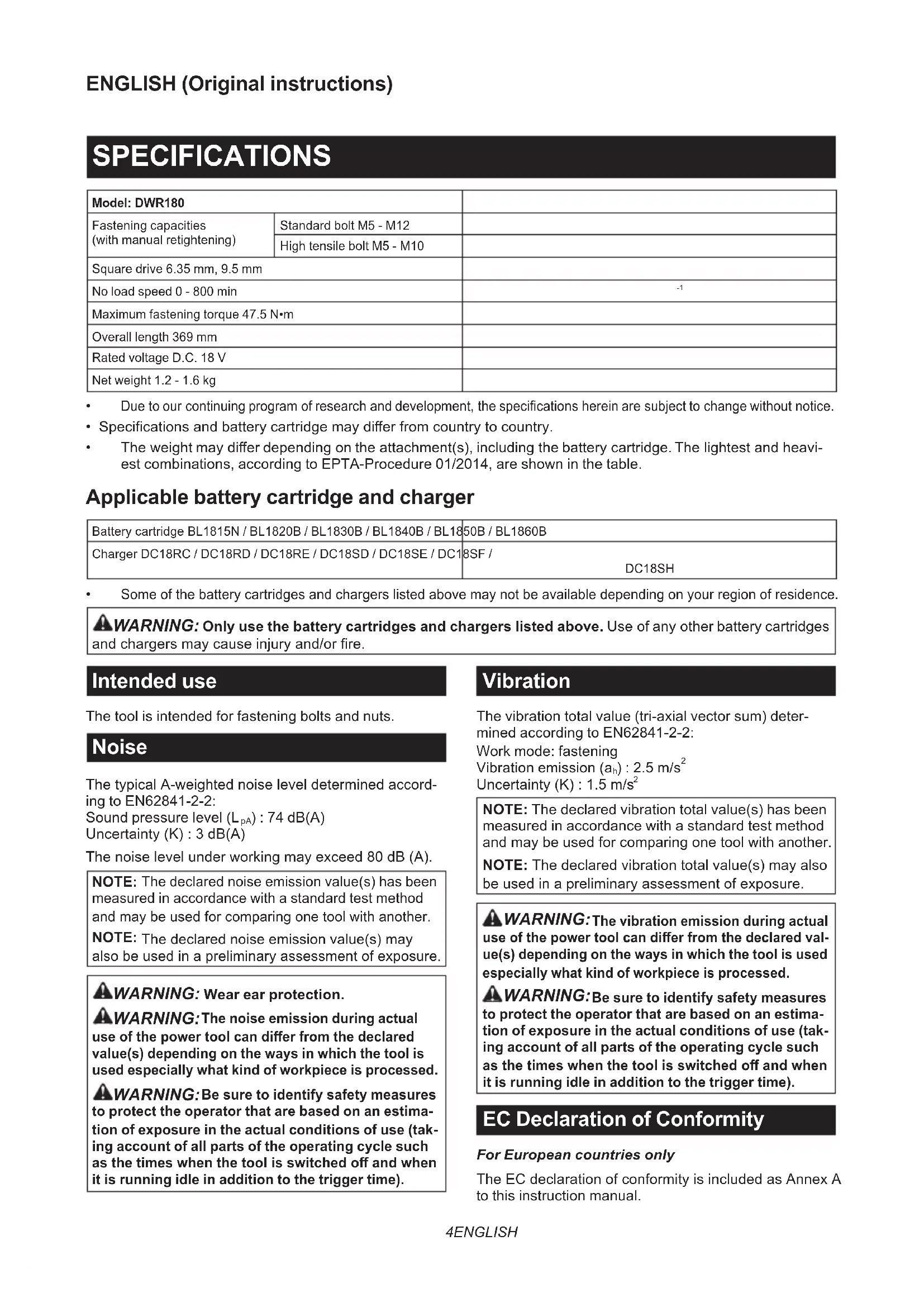 - The weight may dier depending on the attachment(s), including the battery cartridge. The lightest and heavi- est combinations, according to EPTA-Procedure 01/2014, are shown in the table. Applicable battery cartridge and charger Battery cartridge BL1815N / BL1820B / BL1830B / BL1840B / BL1850B / BL1860B Charger DC18RC / DC18RD / DC18RE / DC18SD / DC18SE / DC18SF / DC18SH