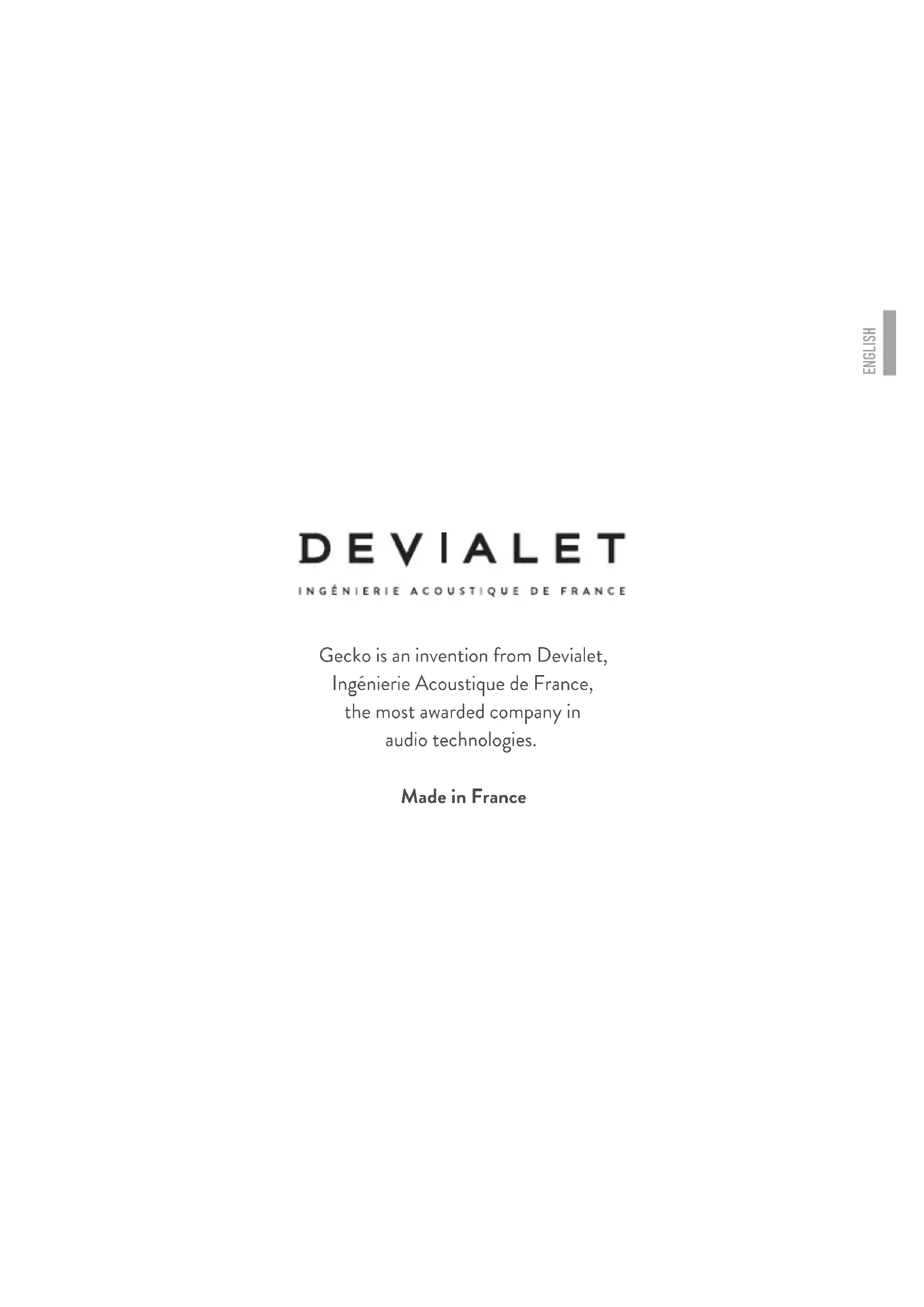 Gecko is an invention from Devialet, Ingénierie Acoustique de France, the most awarded company in audio technologies. Made in France ENGLISH3 Any unauthorized modification could compromise your safety and prevent the device from being used as intended. If you experience any problems, please consult an expert. For your safety, make sure that a disconnecting device (switch or circuit breaker) is installed and easily accessible. In a thunderstorm, turn off the power supply. Make sure that your electrical installation complies with all the electrical standards applicable in your country. — Make sure that the wall on which the Gecko wall mount is to be installed is level, smooth and vertical. — Make sure that the wall on which the Gecko wall mount is to be installed is not damaged and is able to support 22 lbs. at the fixing point. — Only use the screws and dowels provided by DEVIALET for fitting the GECKO. — For each mount type, use the screw and dowel combination stated below. — When drilling into the wall, make sure that the drill bit has the correct diameter and is suitable for the mount. — It is important that the screws are secured to the wall properly to ensure that the device is held in place. — Installation should always be carried out by two people. To avoid the risk of falling, fire and electrocution, please read the following instructions carefully.4 PACK CONTENTS — Assembled Gecko — 1x screw for fixing the Phantom on to the Gecko — 4x dowels for solid materials — 4x screws for solid materials — 4x dowels for hollow materials — 4x screws for hollow materials — 4x screw covers5 To fix the Gecko to the wall, place the drilling markings on the wall with the aid of the product. INSTALLATION Take all the components out of the box and remove the packaging. Drill into your wall, paying close attention to the instructions on the following pages. STEP 1 STEP 2 STEP 36 1 — Walls made of solid material (natural stone, concrete, aerated concrete, solid brick, drywall) or concrete blocks: 4 dowels 5/16” x 2 1/4” 4 screws 3/16” x 2 ” Drilling depth (minimum): 2 3/8” Drilling diameter: 5/16” Ensure that neither the screw nor the dowel spins freely in the hole. 2 — Walls made of solid wood: 4 screws 3/16” x 2” Drilling depth (minimum): 2” Drilling diameter: 3/32”7 3 — 1/2” drywall : 4 dowels 3/8” x 2” 4 screws 3/16” x 2” Drilling diameter: 5/16” Ensure that neither the screw nor the dowel spins freely in the hole. Do not fix to hollow brick. If you do not feel confident or have not understood the contents of this manual, do not fit the Gecko wall mount and seek the help of a professional. Attention: Do not fix the Gecko to a wall made of drywall less than 1/2 inch thick.8 Screw the Gecko onto the wall as tightly as possible using the correct screws, then conceal the latter with the screw covers. STEP 49 Place the Phantom on the Gecko, then tighten the screw provided as far as it will go in order to lock the Phantom on its mount. Attention: The prescribed tightening torque is 44 lb-in. Attention: If people are going to be walking under the GECKO, we recommend fixing the Phantom in place using a steel wire as shown in the image. — Make sure that you keep hold of the Phantom during the procedure. — To avoid damaging your Phantom, do not handle it by the speakers. — Make sure that the Phantom is not plugged in during fitting. Plug in your Phantom. STEP 5 STEP 6 Installation should always be carried out by two people.10 Note: You can adjust the angle of your Phantom as desired (up to +/- 110°). Note 2: You can paint the Gecko to match the matte black of the Phantom; the color code is RAL 9005. Oops! Do you need help? Go to: help.devialet.com Find out more at www.devialet.com 2-YEAR WARRANTY Attention: After changing the position, ensure that the fixing screw is still tight.Gecko est une invention Devialet, Ingénierie Acoustique de France, l’entreprise la plus primée au monde pour ses technologies d’excellence dans le son. Fabriqué en France FRANÇAIS12 Toute modification non autorisée pourrait compromettre votre sécurité ainsi qu’une utilisation normale de l’appareil. En cas de problème, veuillez consulter un expert. Pour votre sécurité, assurez-vous qu’un dispositif de sectionnement (interrupteur ou disjoncteur) est installé et facilement accessible. En cas d’orage, couper le courant. Assurez-vous que votre installation électrique respecte toutes les normes électriques applicables dans votre pays. — Assurez-vous que le mur sur lequel le support mural Gecko sera installé est plan, lisse et vertical. — Assurez-vous que le mur sur lequel le support mural Gecko sera installé est non détérioré, et qu’il est capable de soutenir 10 kg par point de fixation. — Utilisez uniquement les vis et chevilles fournies par DEVIALET pour le montage de GECKO. — Pour chaque type de support, utilisez la combinaison VIS+CHEVILLE indiquée ci-dessous. — Au moment de percer le mur, assurez-vous que le foret est au bon diamètre et adapté au support. — Veillez à correctement visser les vis sur le mur pour assurer le maintien. — Faites toujours l’installation à deux personnes. Pour éviter tout risque de chute, incendie et électrocution, veuillez vous assurer que les instructions suivantes sont bien comprises.13