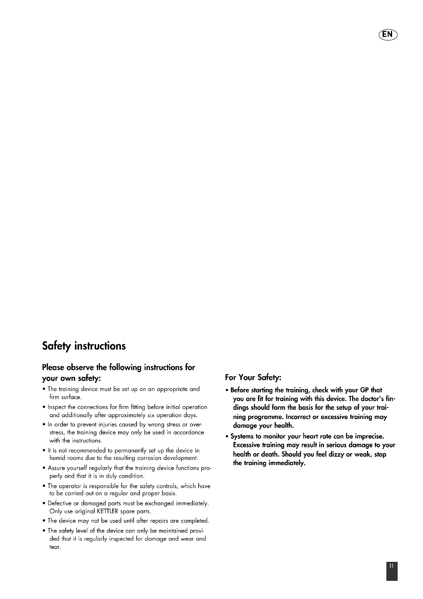 - Defective or damaged parts must be exchanged immediately. Only use original KETTLER spare parts.