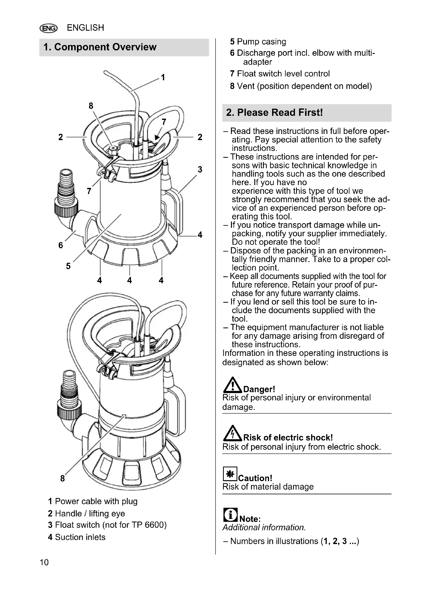 ENGLISH – Read these instructions in full before oper- ating. Pay special attention to the safety instructions. – These instructions are intended for per- sons with basic technical knowledge in handling tools such as the one described here. If you have no experience with this type of tool we strongly recommend that you seek the ad- vice of an experienced person before op- erating this tool. – If you notice transport damage while un- packing, notify your supplier immediately. Do not operate the tool! – Dispose of the packing in an environmen- tally friendly manner. Take to a proper col- lection point. – Keep all documents supplied with the tool for future reference. Retain your proof of pur- chase for any future warranty claims. – If you lend or sell this tool be sure to in- clude the documents supplied with the tool. – The equipment manufacturer is not liable for any damage arising from disregard of these instructions. Information in these operating instructions is designated as shown below: ADanger! Risk of personal injury or environmental damage. BRisk of electric shock! Risk of personal injury from electric shock. A Caution! Risk of material damage 3Note: Additional information. – Numbers in illustrations (1, 2, 3 ...)