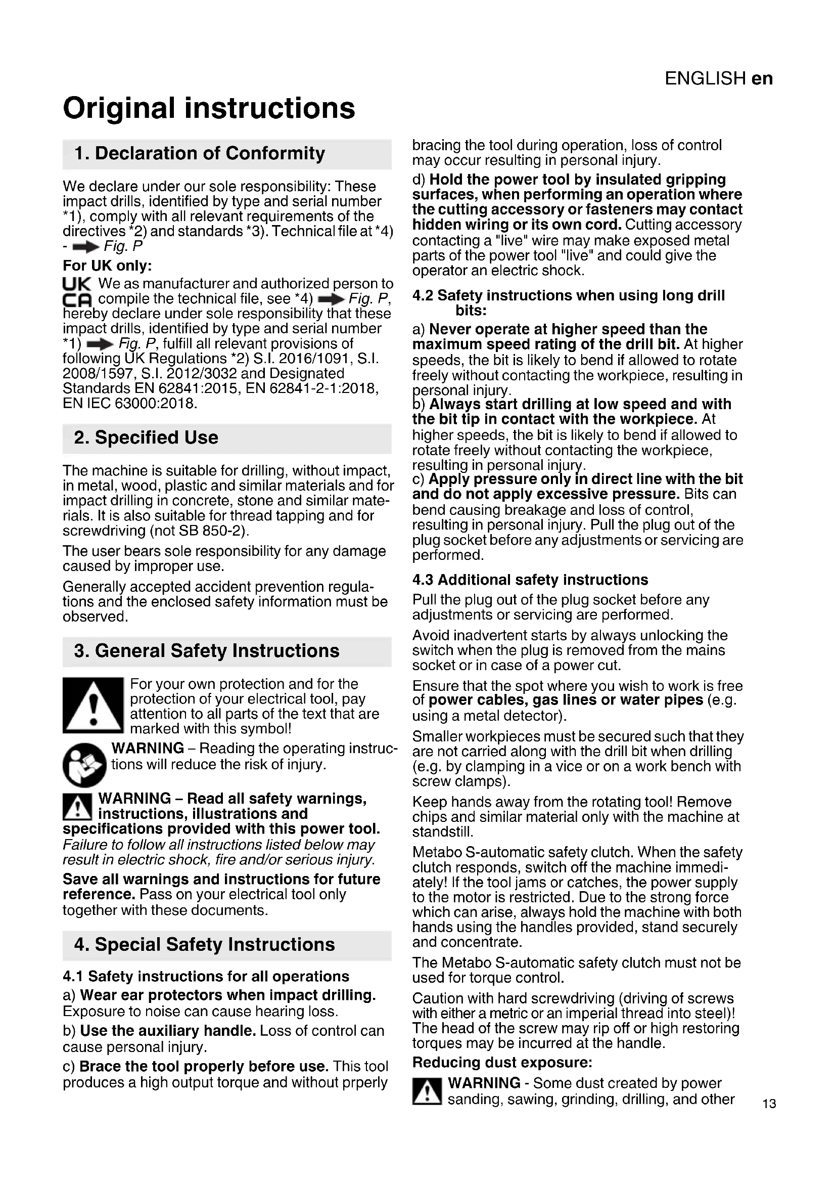 ig. P, fulfill all relevant provisions of following UK Regulations *2) S.I. 2016/1091, S.I. 2008/1597, S.I. 2012/3032 and Designated Standards EN 62841:2015, EN 62841-2-1:2018, EN IEC 63000:2018. The machine is suitable for drilling, without impact, in metal, wood, plastic and similar materials and for impact drilling in concrete, stone and similar mate- rials. It is also suitable for thread tapping and for screwdriving (not SB 850-2). The user bears sole responsibility for any damage caused by improper use. Generally accepted accident prevention regula- tions and the enclosed safety information must be observed. For your own protection and for the protection of your electrical tool, pay attention to all parts of the text that are marked with this symbol! WARNING – Reading the operating instruc- tions will reduce the risk of injury. WARNING – Read all safety warnings, instructions, illustrations and specifications provided with this power tool. Failure to follow all instructions listed below may result in electric shock, fire and/or serious injury. Save all warnings and instructions for future reference. Pass on your electrical tool only together with these documents.