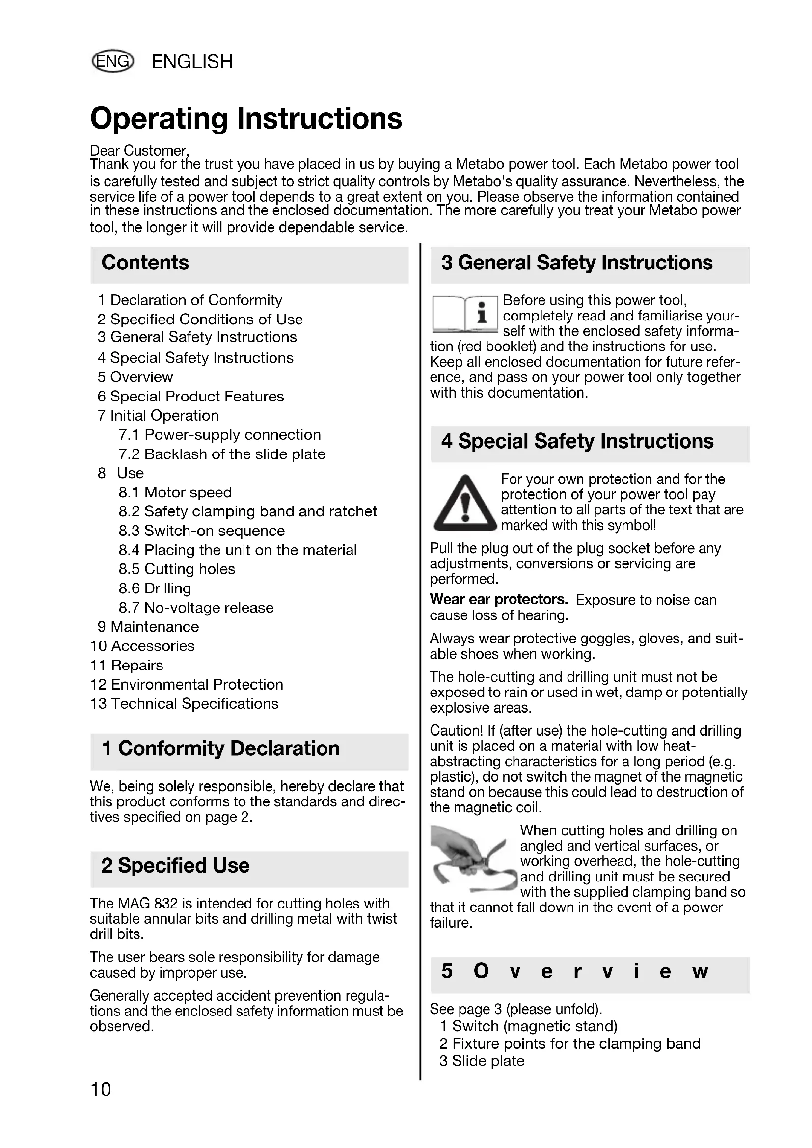 9 Maintenance 10 Accessories 11 Repairs 12 Environmental Protection 13 Technical Specifications We, being solely responsible, hereby declare that this product conforms to the standards and direc- tives specified on page 2. The MAG 832 is intended for cutting holes with suitable annular bits and drilling metal with twist drill bits. The user bears sole responsibility for damage caused by improper use. Generally accepted accident prevention regula- tions and the enclosed safety information must be observed. Before using this power tool, completely read and familiarise your- self with the enclosed safety informa- tion (red booklet) and the instructions for use. Keep all enclosed documentation for future refer- ence, and pass on your power tool only together with this documentation. For your own protection and for the protection of your power tool pay attention to all parts of the text that are marked with this symbol! Pull the plug out of the plug socket before any adjustments, conversions or servicing are performed. Wear ear protectors. Exposure to noise can cause loss of hearing. Always wear protective goggles, gloves, and suit- able shoes when working. The hole-cutting and drilling unit must not be exposed to rain or used in wet, damp or potentially explosive areas. Caution! If (after use) the hole-cutting and drilling unit is placed on a material with low heat- abstracting characteristics for a long period (e.g. plastic), do not switch the magnet of the magnetic stand on because this could lead to destruction of the magnetic coil. When cutting holes and drilling on angled and vertical surfaces, or working overhead, the hole-cutting and drilling unit must be secured with the supplied clamping band so that it cannot fall down in the event of a power failure. See page 3 (please unfold). 1 Switch (magnetic stand) 2 Fixture points for the clamping band 3 Slide plate Operating Instructions Dear Customer, Thank you for the trust you have placed in us by buying a Metabo power tool. Each Metabo power tool is carefully tested and subject to strict quality controls by Metabo's quality assurance. Nevertheless, the service life of a power tool depends to a great extent on you. Please observe the information contained in these instructions and the enclosed documentation. The more carefully you treat your Metabo power tool, the longer it will provide dependable service. Contents 1 Conformity Declaration 2 Specified Use 3 General Safety Instructions 4 Special Safety Instructions 5Overview 170 22 3900 - MAG.book Seite 10 Donnerstag, 27. Oktober 2005 11:39 11ENGLISH