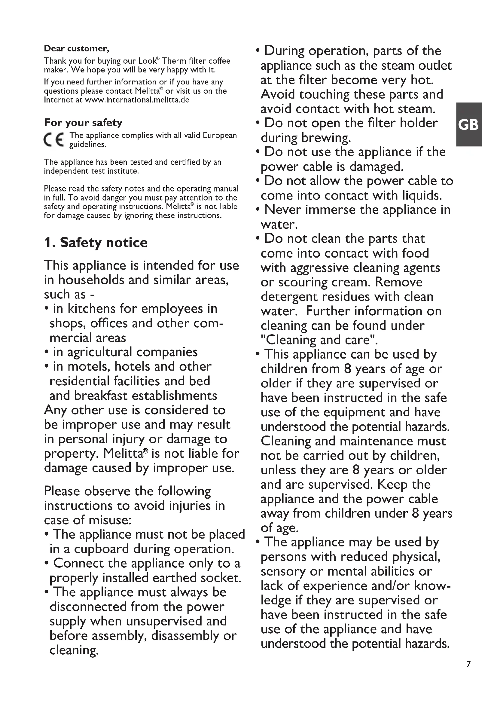 The appliance complies with all valid European guidelines. The appliance has been tested and certified by an independent test institute. Please read the safety notes and the operating manual in full. To avoid danger you must pay attention to the safety and operating instructions. Melitta