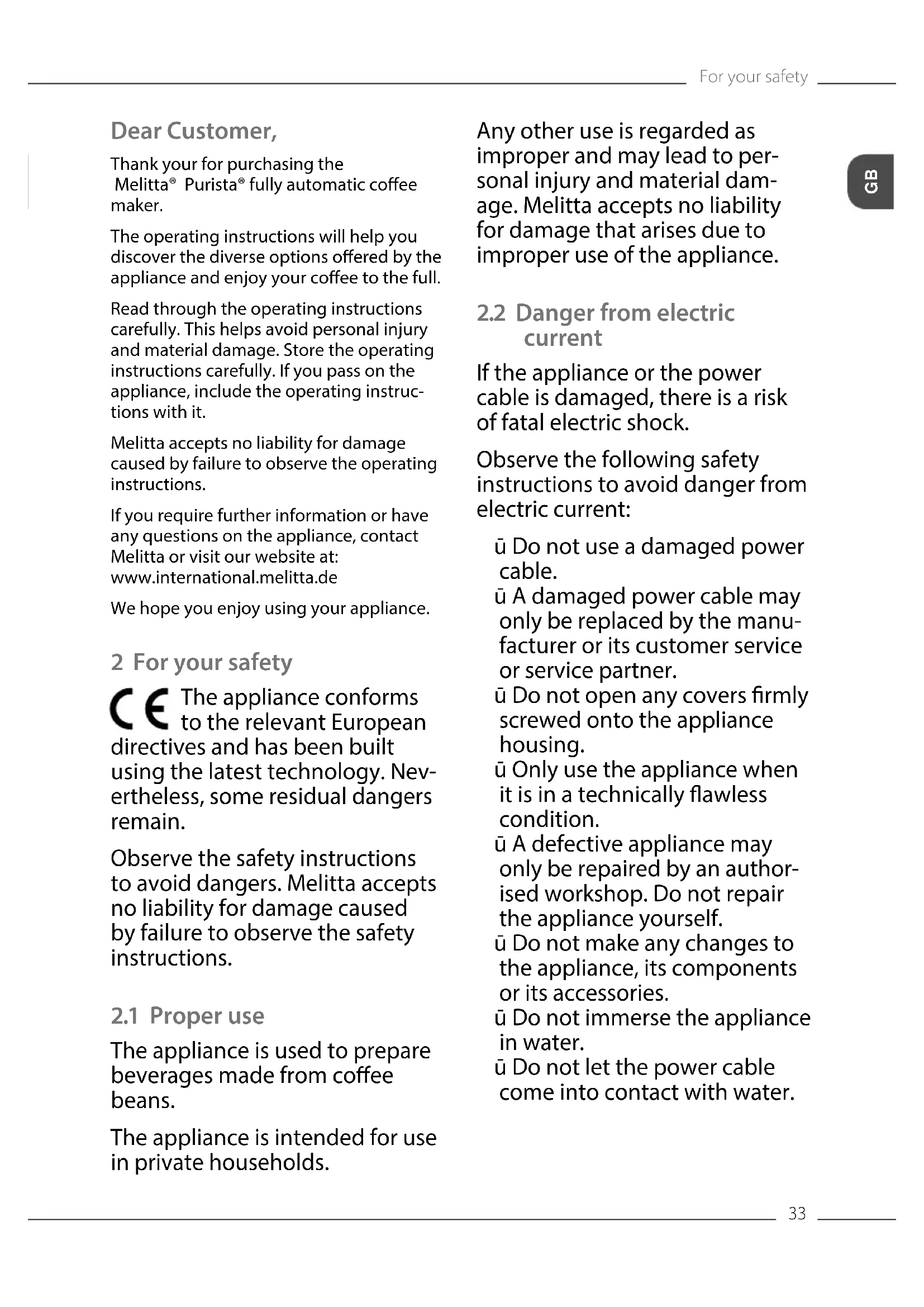 Dear Customer, Thank your for purchasing the Melitta® Purista® fully automatic coee maker. The operating instructions will help you discover the diverse options oered by the appliance and enjoy your coee to the full. Read through the operating instructions carefully. This helps avoid personal injury and material damage. Store the operating instructions carefully. If you pass on the appliance, include the operating instruc- tions with it. Melitta accepts no liability for damage caused by failure to observe the operating instructions. If you require further information or have any questions on the appliance, contact Melitta or visit our website at: www.international.melitta.de We hope you enjoy using your appliance. 2 For your safety The appliance conforms to the relevant European directives and has been built using the latest technology. Nev- ertheless, some residual dangers remain. Observe the safety instructions to avoid dangers. Melitta accepts no liability for damage caused by failure to observe the safety instructions.