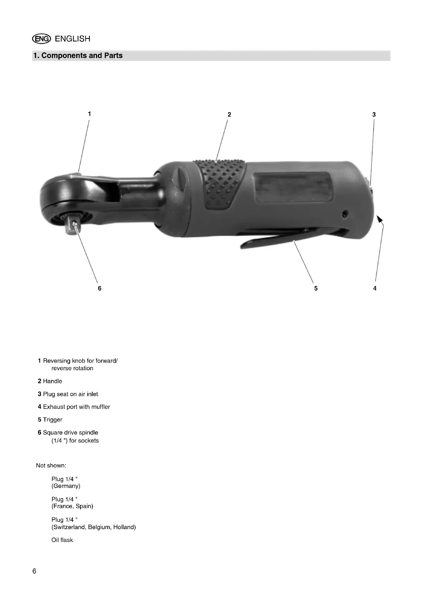 1 Reversing knob for forward/ reverse rotation 2 Handle 3 Plug seat on air inlet 4 Exhaust port with muffler 5 Trigger 6 Square drive spindle (1/4 ") for sockets Not shown: Plug 1/4 " (Germany) Plug 1/4 " (France, Spain) Plug 1/4 " (Switzerland, Belgium, Holland) Oil flask XK0042E2.fm Original operating instructions ENGLISH7 ENGLISH