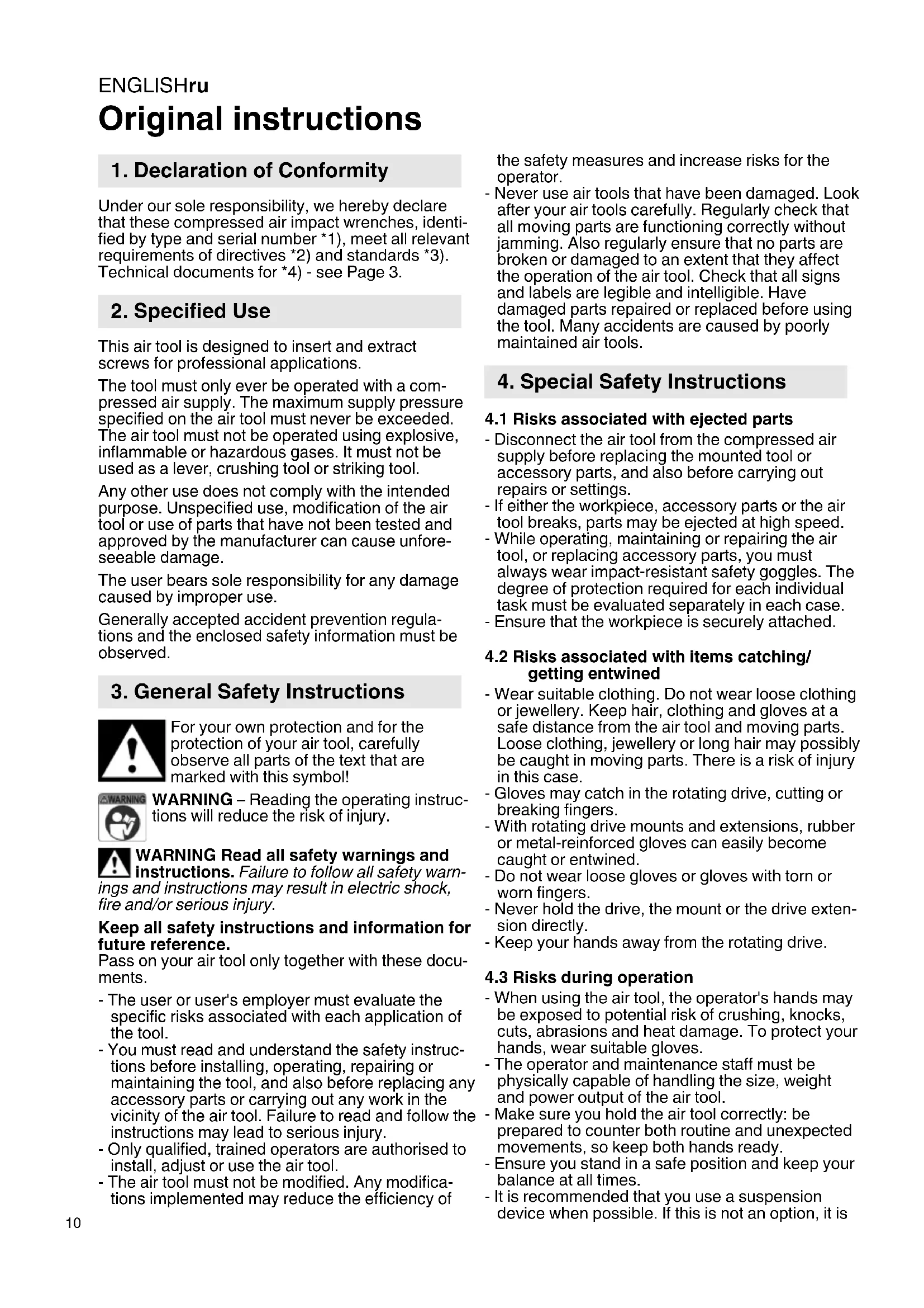 Original instructions Under our sole responsibility, we hereby declare that these compressed air impact wrenches, identi- fied by type and serial number *1), meet all relevant requirements of directives *2) and standards *3). Technical documents for *4) - see Page 3. This air tool is designed to insert and extract screws for professional applications. The tool must only ever be operated with a com- pressed air supply. The maximum supply pressure specified on the air tool must never be exceeded. The air tool must not be operated using explosive, inflammable or hazardous gases. It must not be used as a lever, crushing tool or striking tool. Any other use does not comply with the intended purpose. Unspecified use, modification of the air tool or use of parts that have not been tested and approved by the manufacturer can cause unfore- seeable damage. The user bears sole responsibility for any damage caused by improper use. Generally accepted accident prevention regula- tions and the enclosed safety information must be observed. For your own protection and for the protection of your air tool, carefully observe all parts of the text that are marked with this symbol! WARNING – Reading the operating instruc- tions will reduce the risk of injury. WARNING Read all safety warnings and instructions. Failure to follow all safety warn- ings and instructions may result in electric shock, fire and/or serious injury. Keep all safety instructions and information for future reference. Pass on your air tool only together with these docu- ments. - The user or user's employer must evaluate the specific risks associated with each application of the tool. - You must read and understand the safety instruc- tions before installing, operating, repairing or maintaining the tool, and also before replacing any accessory parts or carrying out any work in the vicinity of the air tool. Failure to read and follow the instructions may lead to serious injury. - Only qualified, trained operators are authorised to install, adjust or use the air tool. - The air tool must not be modified. Any modifica- tions implemented may reduce the efficiency of the safety measures and increase risks for the operator. - Never use air tools that have been damaged. Look after your air tools carefully. Regularly check that all moving parts are functioning correctly without jamming. Also regularly ensure that no parts are broken or damaged to an extent that they affect the operation of the air tool. Check that all signs and labels are legible and intelligible. Have damaged parts repaired or replaced before using the tool. Many accidents are caused by poorly maintained air tools.