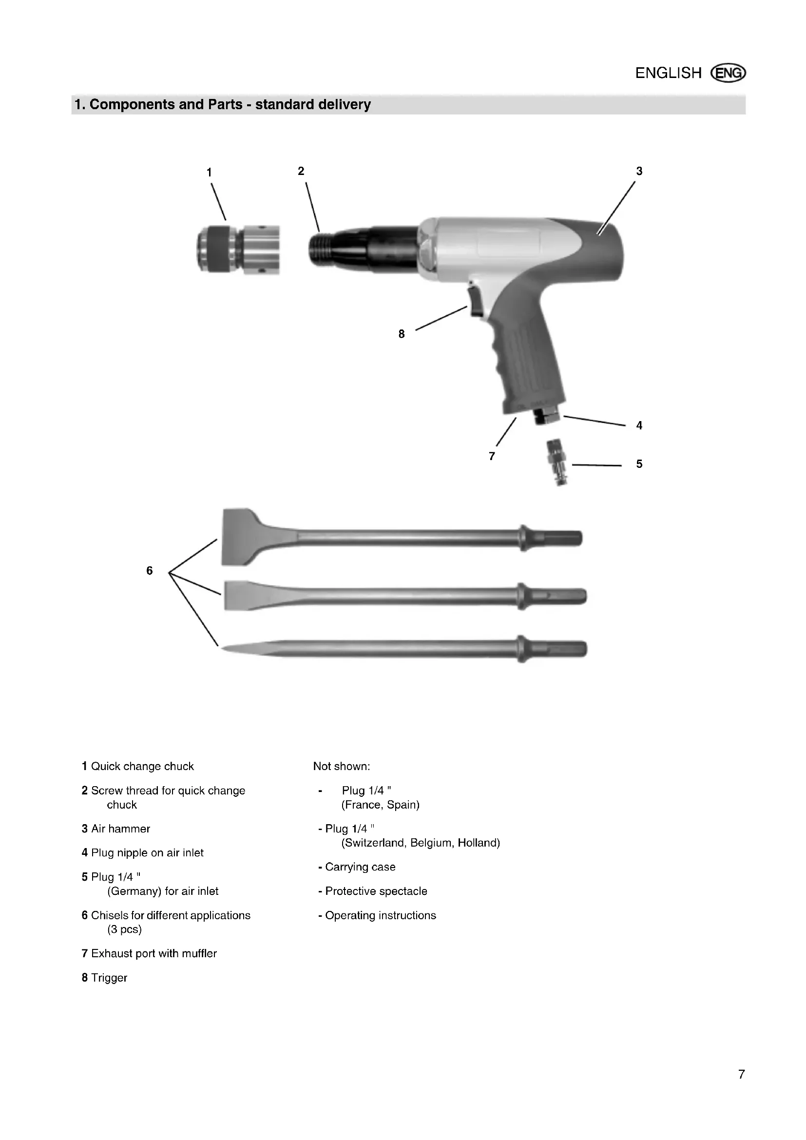 1 Quick change chuck 2 Screw thread for quick change chuck 3 Air hammer 4 Plug nipple on air inlet 5 Plug 1/4 " (Germany) for air inlet 6 Chisels for different applications (3 pcs) 7 Exhaust port with muffler 8 Trigger Not shown: - Plug 1/4 " (France, Spain) - Plug 1/4 " (Switzerland, Belgium, Holland) - Carrying case - Protective spectacle - Operating instructions XK0044E2.fm Original operating instructions ENGLISH8 ENGLISH