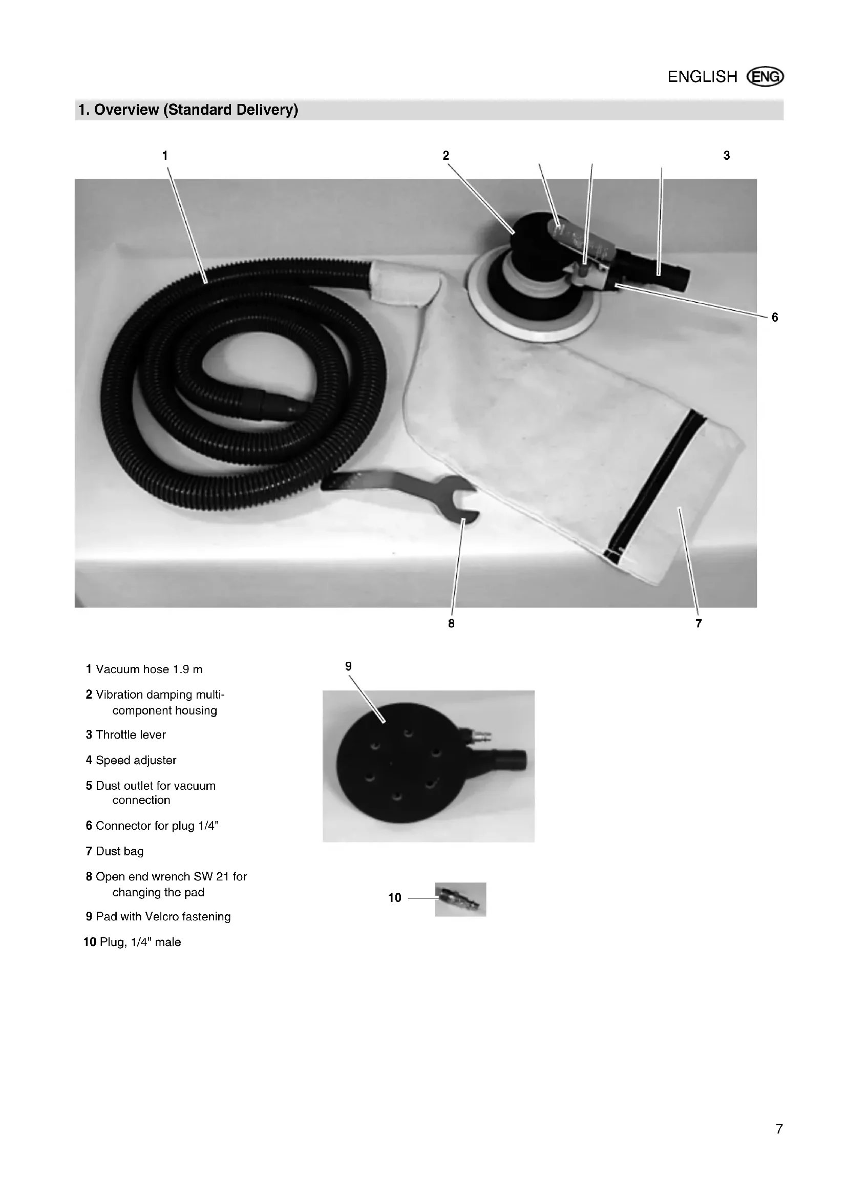 1 Vacuum hose 1.9 m 2 Vibration damping multi- component housing 3 Throttle lever 4 Speed adjuster 5 Dust outlet for vacuum connection 6 Connector for plug 1/4" 7 Dust bag 8 Open end wrench SW 21 for changing the pad 9 Pad with Velcro fastening 10 Plug, 1/4" male