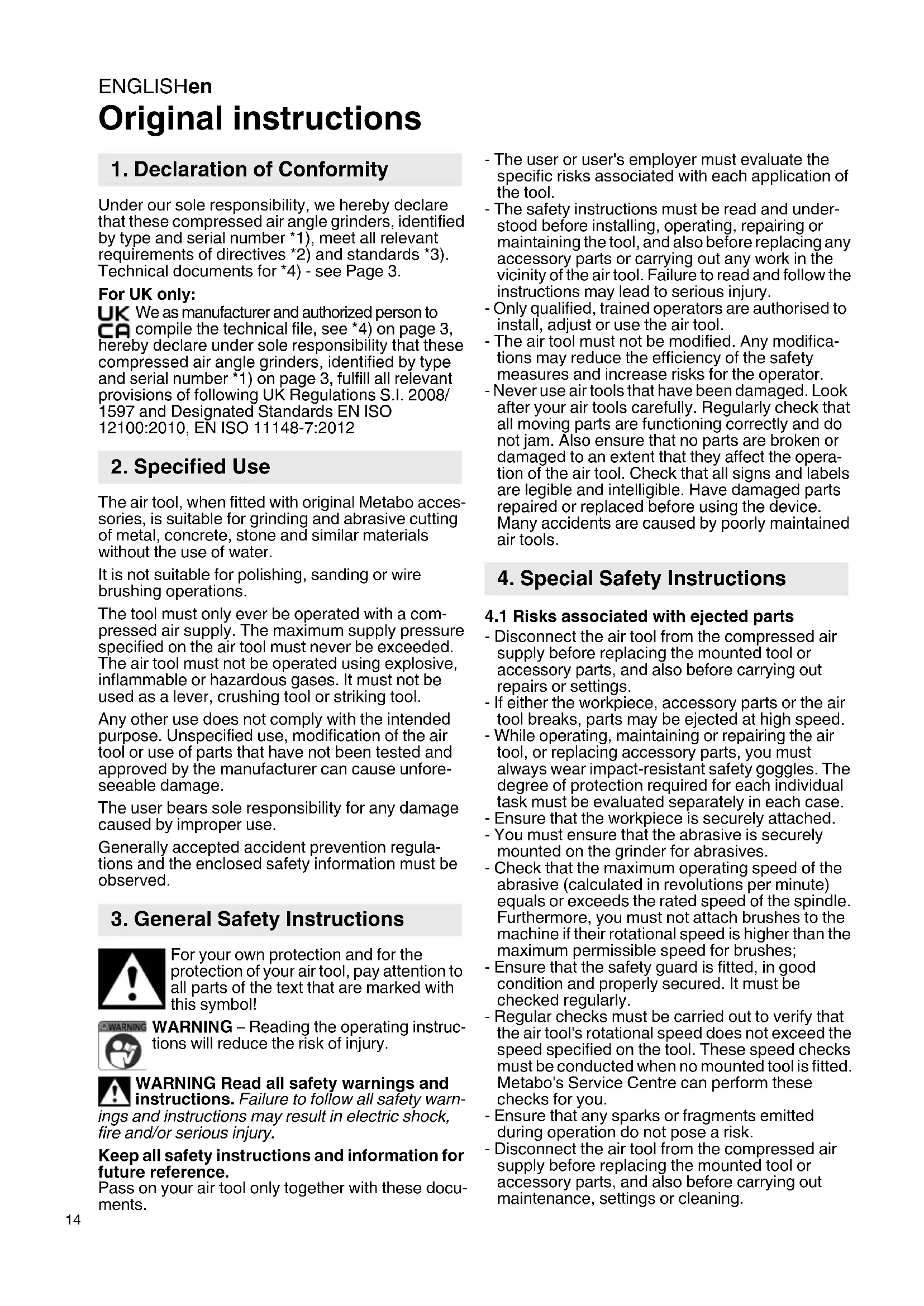 The air tool, when fitted with original Metabo acces- sories, is suitable for grinding and abrasive cutting of metal, concrete, stone and similar materials without the use of water. It is not suitable for polishing, sanding or wire brushing operations. The tool must only ever be operated with a com- pressed air supply. The maximum supply pressure specified on the air tool must never be exceeded. The air tool must not be operated using explosive, inflammable or hazardous gases. It must not be used as a lever, crushing tool or striking tool. Any other use does not comply with the intended purpose. Unspecified use, modification of the air tool or use of parts that have not been tested and approved by the manufacturer can cause unfore- seeable damage. The user bears sole responsibility for any damage caused by improper use. Generally accepted accident prevention regula- tions and the enclosed safety information must be observed. For your own protection and for the protection of your air tool, pay attention to all parts of the text that are marked with this symbol! WARNING – Reading the operating instruc- tions will reduce the risk of injury. WARNING Read all safety warnings and instructions. Failure to follow all safety warn- ings and instructions may result in electric shock, fire and/or serious injury. Keep all safety instructions and information for future reference. Pass on your air tool only together with these docu- ments. - The user or user's employer must evaluate the specific risks associated with each application of the tool. - The safety instructions must be read and under- stood before installing, operating, repairing or maintaining the tool, and also before replacing any accessory parts or carrying out any work in the vicinity of the air tool. Failure to read and follow the instructions may lead to serious injury. - Only qualified, trained operators are authorised to install, adjust or use the air tool. - The air tool must not be modified. Any modifica- tions may reduce the efficiency of the safety measures and increase risks for the operator. - Never use air tools that have been damaged. Look after your air tools carefully. Regularly check that all moving parts are functioning correctly and do not jam. Also ensure that no parts are broken or damaged to an extent that they affect the opera- tion of the air tool. Check that all signs and labels are legible and intelligible. Have damaged parts repaired or replaced before using the device. Many accidents are caused by poorly maintained air tools.