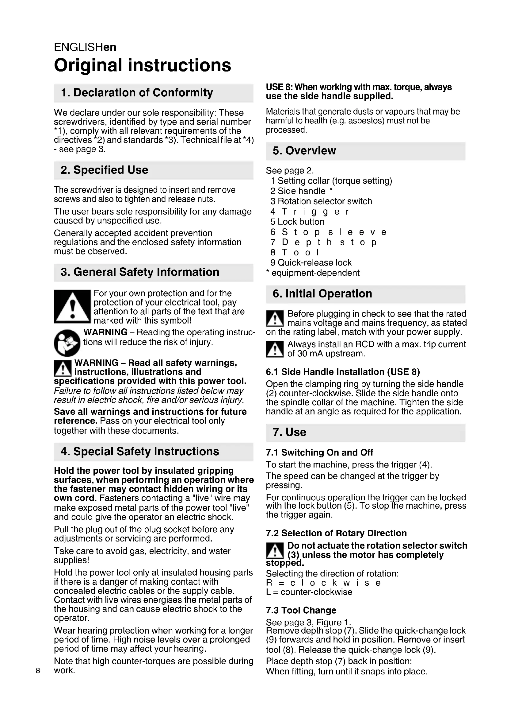 Original instructions We declare under our sole responsibility: These screwdrivers, identified by type and serial number *1), comply with all relevant requirements of the directives *2) and standards *3). Technical file at *4) - see page 3. The screwdriver is designed to insert and remove screws and also to tighten and release nuts. The user bears sole responsibility for any damage caused by unspecified use. Generally accepted accident prevention regulations and the enclosed safety information must be observed. For your own protection and for the protection of your electrical tool, pay attention to all parts of the text that are marked with this symbol! WARNING – Reading the operating instruc- tions will reduce the risk of injury. WARNING – Read all safety warnings, instructions, illustrations and specifications provided with this power tool. Failure to follow all instructions listed below may result in electric shock, fire and/or serious injury. Save all warnings and instructions for future reference. Pass on your electrical tool only together with these documents. Hold the power tool by insulated gripping surfaces, when performing an operation where the fastener may contact hidden wiring or its own cord. Fasteners contacting a "live" wire may make exposed metal parts of the power tool "live" and could give the operator an electric shock. Pull the plug out of the plug socket before any adjustments or servicing are performed. Take care to avoid gas, electricity, and water supplies! Hold the power tool only at insulated housing parts if there is a danger of making contact with concealed electric cables or the supply cable. Contact with live wires energises the metal parts of the housing and can cause electric shock to the operator. Wear hearing protection when working for a longer period of time. High noise levels over a prolonged period of time may affect your hearing. Note that high counter-torques are possible during work. USE 8: When working with max. torque, always use the side handle supplied. Materials that generate dusts or vapours that may be harmful to health (e.g. asbestos) must not be processed. See page 2. 1 Setting collar (torque setting) 2 Side handle