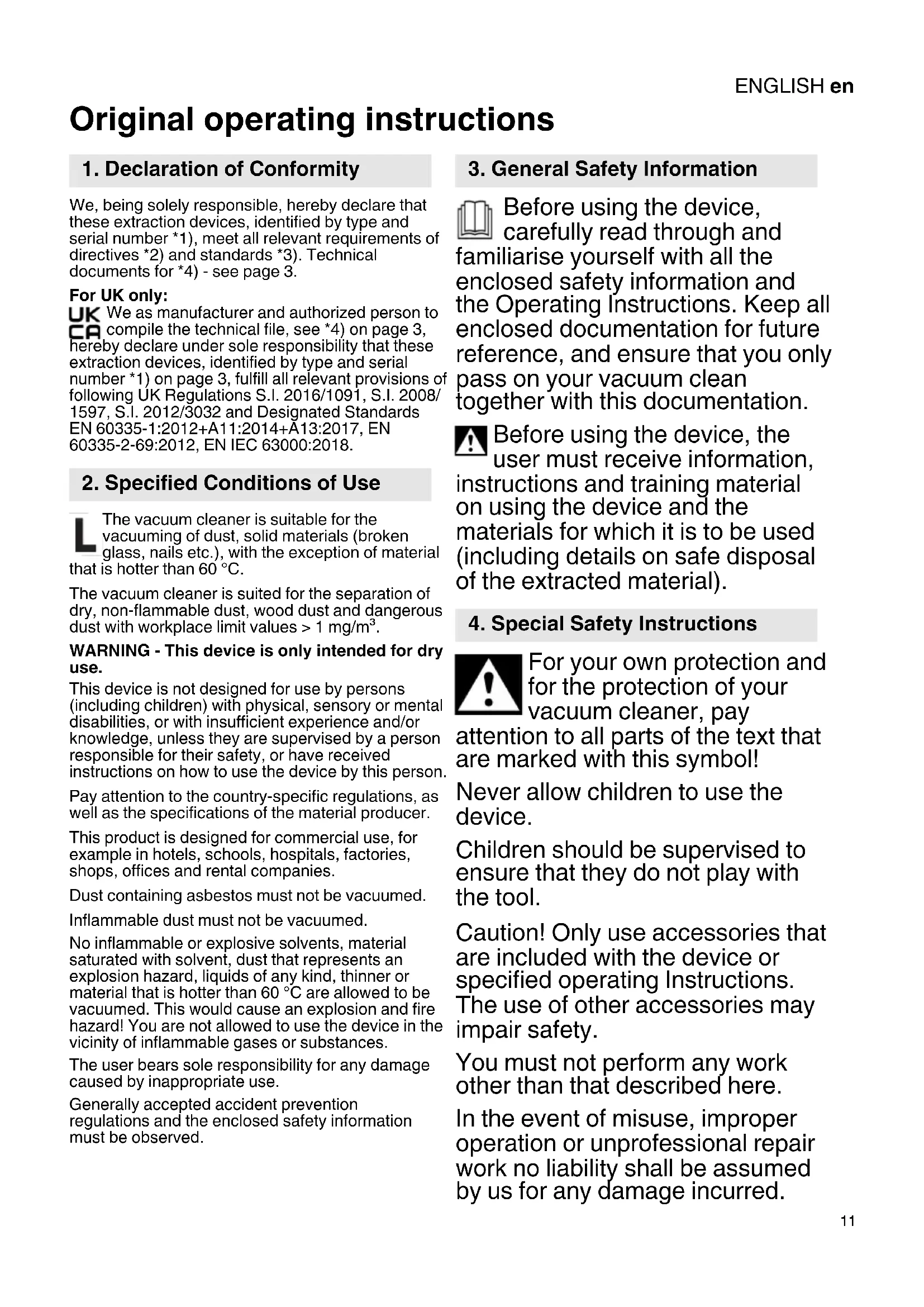 Original operating instructions We, being solely responsible, hereby declare that these extraction devices, identified by type and serial number *1), meet all relevant requirements of directives *2) and standards *3). Technical documents for *4) - see page 3. For UK only: We as manufacturer and authorized person to compile the technical file, see *4) on page 3, hereby declare under sole responsibility that these extraction devices, identified by type and serial number *1) on page 3, fulfill all relevant provisions of following UK Regulations S.I. 2016/1091, S.I. 2008/ 1597, S.I. 2012/3032 and Designated Standards EN 60335-1:2012+A11:2014+A13:2017, EN 60335-2-69:2012, EN IEC 63000:2018. The vacuum cleaner is suitable for the vacuuming of dust, solid materials (broken glass, nails etc.), with the exception of material that is hotter than 60 °C. The vacuum cleaner is suited for the separation of dry, non-flammable dust, wood dust and dangerous dust with workplace limit values > 1 mg/m³. WARNING - This device is only intended for dry use. This device is not designed for use by persons (including children) with physical, sensory or mental disabilities, or with insufficient experience and/or knowledge, unless they are supervised by a person responsible for their safety, or have received instructions on how to use the device by this person. Pay attention to the country-specific regulations, as well as the specifications of the material producer. This product is designed for commercial use, for example in hotels, schools, hospitals, factories, shops, offices and rental companies. Dust containing asbestos must not be vacuumed. Inflammable dust must not be vacuumed. No inflammable or explosive solvents, material saturated with solvent, dust that represents an explosion hazard, liquids of any kind, thinner or material that is hotter than 60 °C are allowed to be vacuumed. This would cause an explosion and fire hazard! You are not allowed to use the device in the vicinity of inflammable gases or substances. The user bears sole responsibility for any damage caused by inappropriate use. Generally accepted accident prevention regulations and the enclosed safety information must be observed. Before using the device, carefully read through and familiarise yourself with all the enclosed safety information and the Operating Instructions. Keep all enclosed documentation for future reference, and ensure that you only pass on your vacuum clean together with this documentation. Before using the device, the user must receive information, instructions and training material on using the device and the materials for which it is to be used (including details on safe disposal of the extracted material). For your own protection and for the protection of your vacuum cleaner, pay attention to all parts of the text that are marked with this symbol! Never allow children to use the device. Children should be supervised to ensure that they do not play with the tool. Caution! Only use accessories that are included with the device or specified operating Instructions. The use of other accessories may impair safety. You must not perform any work other than that described here. In the event of misuse, improper operation or unprofessional repair work no liability shall be assumed by us for any damage incurred.
