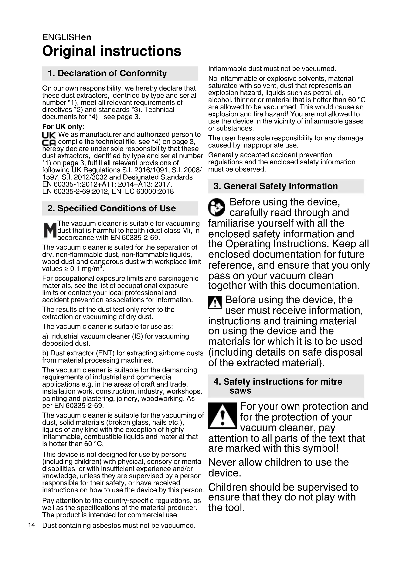 Original instructions On our own responsibility, we hereby declare that these dust extractors, identified by type and serial number *1), meet all relevant requirements of directives *2) and standards *3). Technical documents for *4) - see page 3. For UK only: We as manufacturer and authorized person to compile the technical file, see *4) on page 3, hereby declare under sole responsibility that these dust extractors, identified by type and serial number *1) on page 3, fulfill all relevant provisions of following UK Regulations S.I. 2016/1091, S.I. 2008/ 1597, S.I. 2012/3032 and Designated Standards EN 60335-1:2012+A11: 2014+A13: 2017,