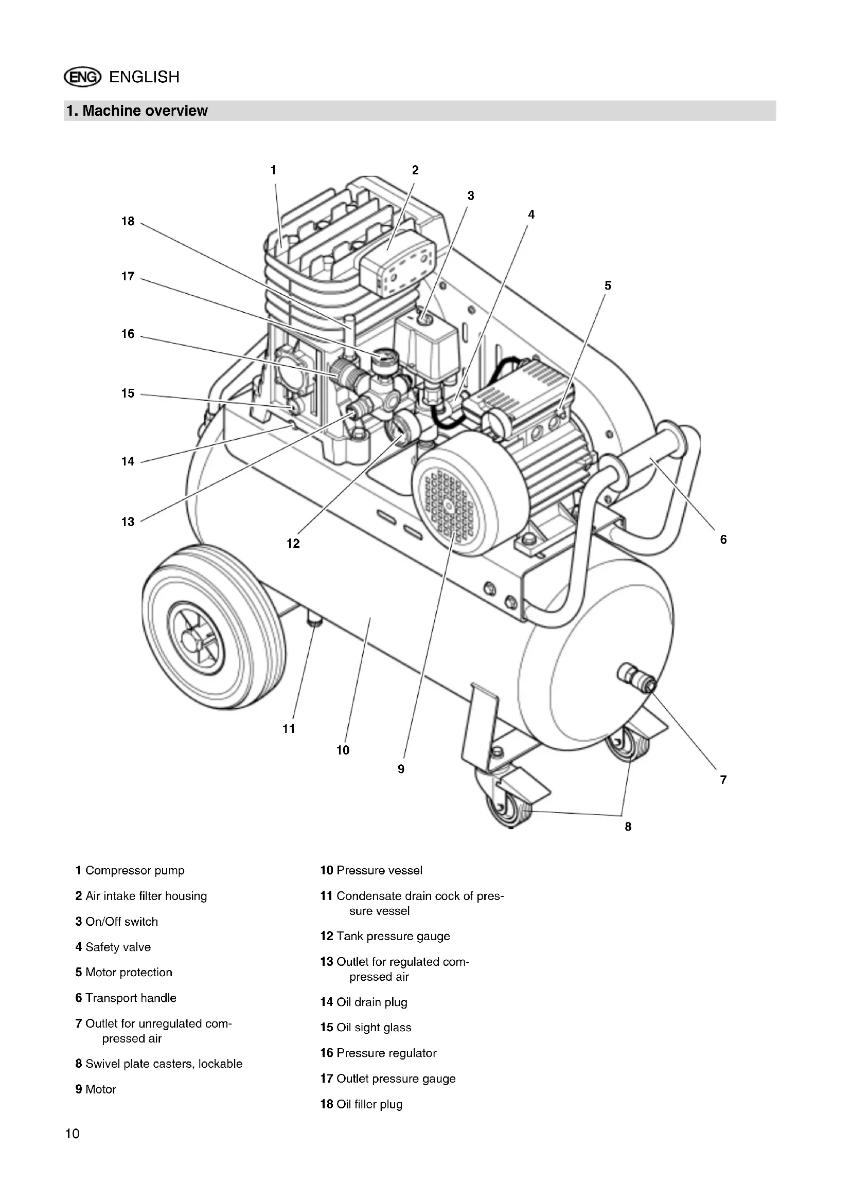 1 Compressor pump 2 Air intake filter housing 3 On/Off switch 4 Safety valve 5 Motor protection 6 Transport handle 7 Outlet for unregulated com- pressed air 8 Swivel plate casters, lockable 9 Motor 10 Pressure vessel 11 Condensate drain cock of pres- sure vessel 12 Tank pressure gauge 13 Outlet for regulated com- pressed air 14 Oil drain plug 15 Oil sight glass 16 Pressure regulator 17 Outlet pressure gauge 18 Oil filler plug XK0022E.fm Operating Instruction ENGLISH11 ENGLISH