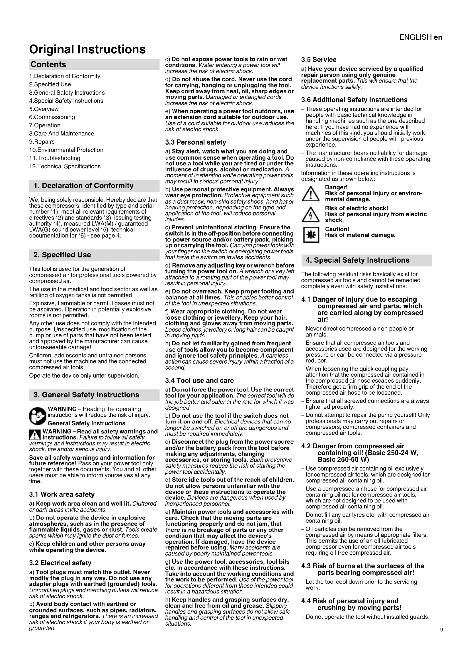 Original Instructions 1.Declaration of Conformity 2.Specified Use 3.General Safety Instructions 4.Special Safety Instructions 5.Overview 6.Commissioning 7.Operation 8.Care And Maintenance 9.Repairs 10.Environmental Protection 11.Troubleshooting 12.Technical Specifications We, being solely responsible: Hereby declare that these compressors, identified by type and serial number *1), meet all relevant requirements of directives *2) and standards *3). issuing testing authority *4), measured LWA(M) / guaranteed LWA(G) sound power level *5), technical documentation for *6) - see page 4. This tool is used for the generation of compressed air for professional tools powered by compressed air. The use in the medical and food sector as well as refilling of oxygen tanks is not permitted. Explosive, flammable or harmful gases must not be aspirated. Operation in potentially explosive rooms is not permitted. Any other use does not comply with the intended purpose. Unspecified use, modification of the pump or use of parts that have not been tested and approved by the manufacturer can cause unforeseeable damage! Children, adolescents and untrained persons must not use the machine and the connected compressed air tools. Operate the device only unter supervision. WARNING – Reading the operating instructions will reduce the risk of injury. General Safety Instructions WARNING – Read all safety warnings and instructions. Failure to follow all safety warnings and instructions may result in electric shock, fire and/or serious injury. Save all safety warnings and information for future reference! Pass on your power tool only together with these documents. You and all other users must be able to inform yourselves at any time.
