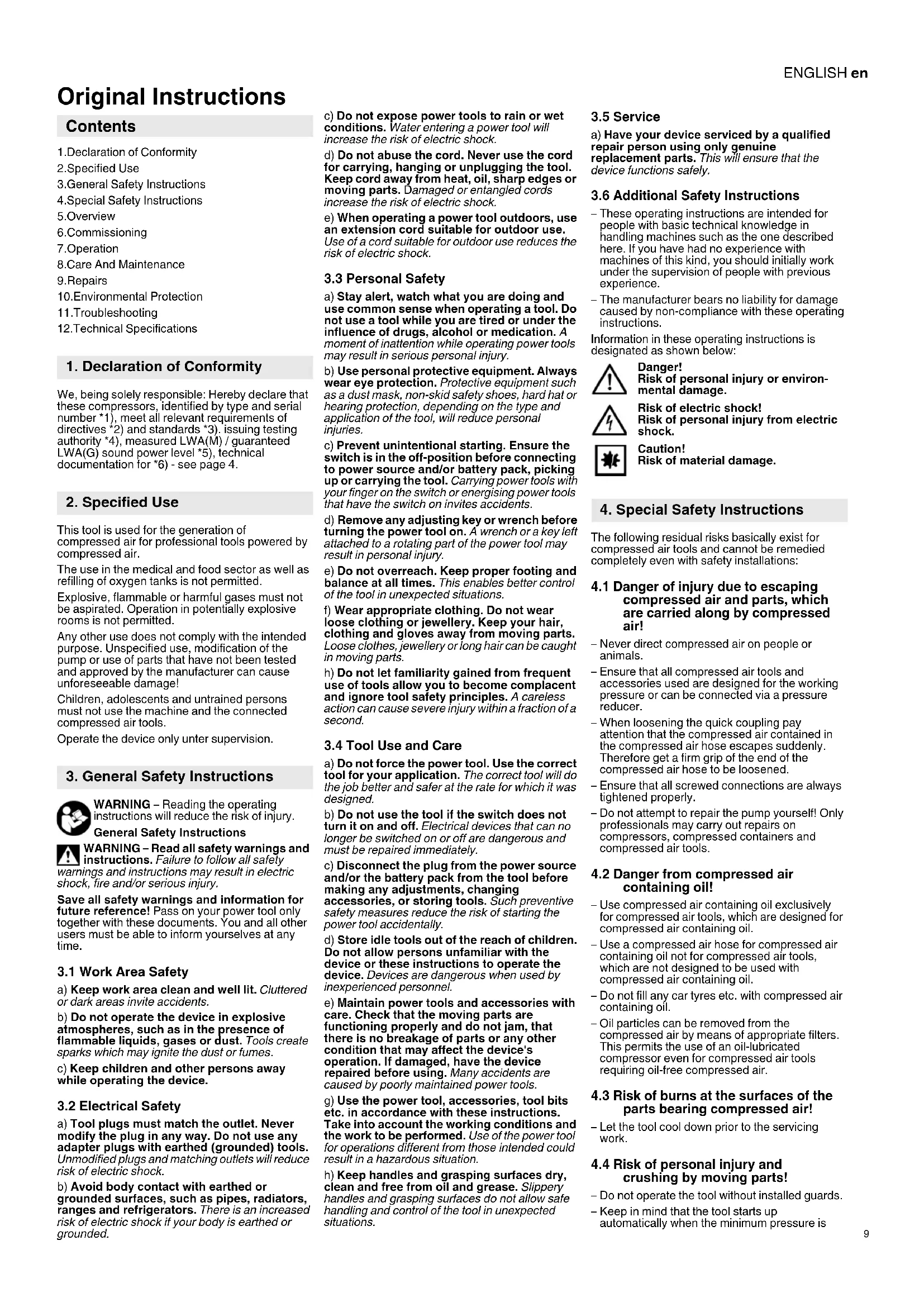 Original Instructions 1.Declaration of Conformity 2.Specified Use 3.General Safety Instructions 4.Special Safety Instructions 5.Overview 6.Commissioning 7.Operation 8.Care And Maintenance 9.Repairs 10.Environmental Protection 11.Troubleshooting 12.Technical Specifications We, being solely responsible: Hereby declare that these compressors, identified by type and serial number *1), meet all relevant requirements of directives *2) and standards *3). issuing testing authority *4), measured LWA(M) / guaranteed LWA(G) sound power level *5), technical documentation for *6) - see page 4. This tool is used for the generation of compressed air for professional tools powered by compressed air. The use in the medical and food sector as well as refilling of oxygen tanks is not permitted. Explosive, flammable or harmful gases must not be aspirated. Operation in potentially explosive rooms is not permitted. Any other use does not comply with the intended purpose. Unspecified use, modification of the pump or use of parts that have not been tested and approved by the manufacturer can cause unforeseeable damage! Children, adolescents and untrained persons must not use the machine and the connected compressed air tools. Operate the device only unter supervision. WARNING – Reading the operating instructions will reduce the risk of injury. General Safety Instructions WARNING – Read all safety warnings and instructions. Failure to follow all safety warnings and instructions may result in electric shock, fire and/or serious injury. Save all safety warnings and information for future reference! Pass on your power tool only together with these documents. You and all other users must be able to inform yourselves at any time.