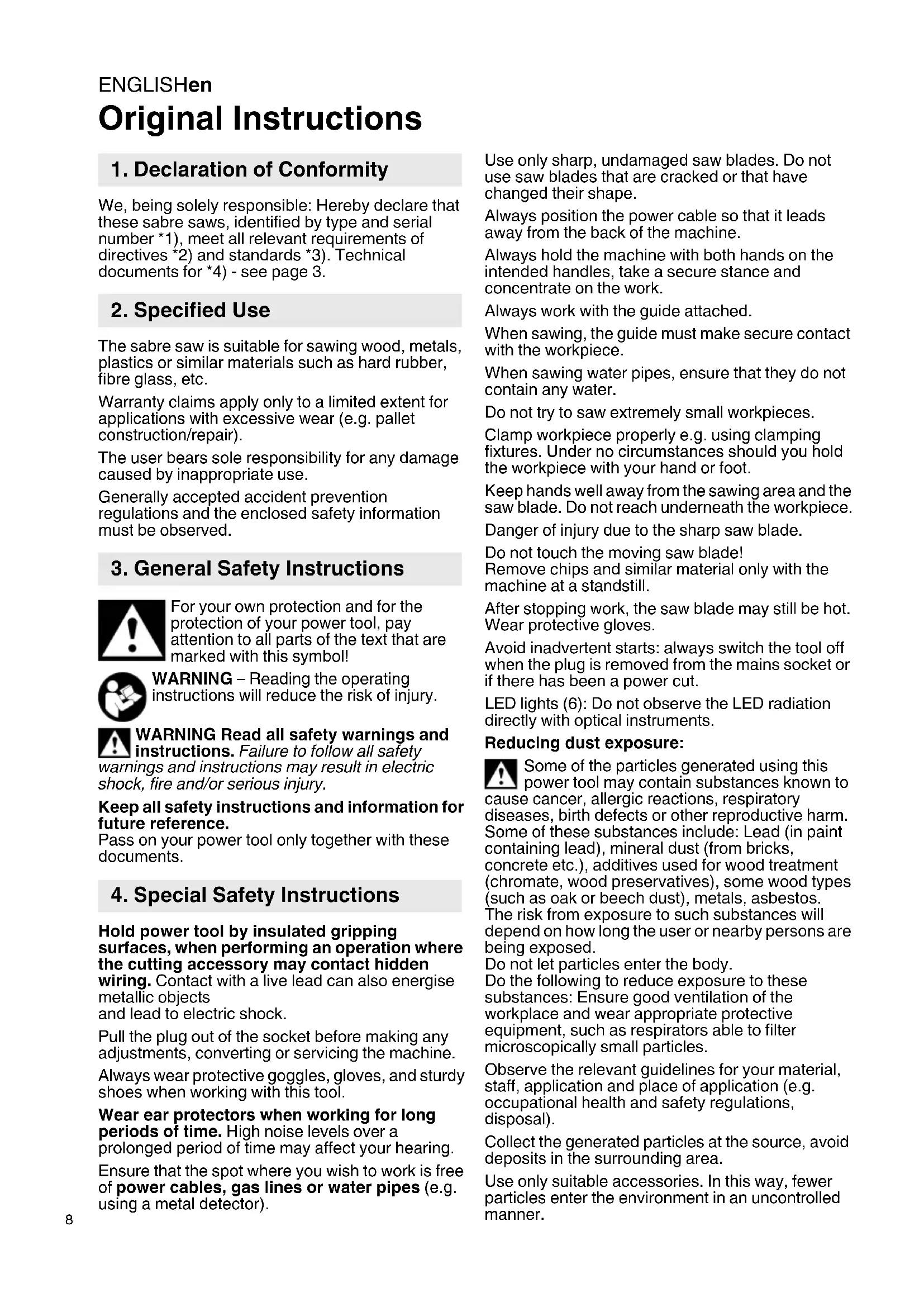 Original Instructions We, being solely responsible: Hereby declare that these sabre saws, identified by type and serial number *1), meet all relevant requirements of directives *2) and standards *3). Technical documents for *4) - see page 3. The sabre saw is suitable for sawing wood, metals, plastics or similar materials such as hard rubber, fibre glass, etc. Warranty claims apply only to a limited extent for applications with excessive wear (e.g. pallet construction/repair). The user bears sole responsibility for any damage caused by inappropriate use. Generally accepted accident prevention regulations and the enclosed safety information must be observed. For your own protection and for the protection of your power tool, pay attention to all parts of the text that are marked with this symbol! WARNING – Reading the operating instructions will reduce the risk of injury. WARNING Read all safety warnings and instructions. Failure to follow all safety warnings and instructions may result in electric shock, fire and/or serious injury. Keep all safety instructions and information for future reference. Pass on your power tool only together with these documents. Hold power tool by insulated gripping surfaces, when performing an operation where the cutting accessory may contact hidden wiring. Contact with a live lead can also energise metallic objects and lead to electric shock. Pull the plug out of the socket before making any adjustments, converting or servicing the machine. Always wear protective goggles, gloves, and sturdy shoes when working with this tool. Wear ear protectors when working for long periods of time. High noise levels over a prolonged period of time may affect your hearing. Ensure that the spot where you wish to work is free of power cables, gas lines or water pipes (e.g. using a metal detector). Use only sharp, undamaged saw blades. Do not use saw blades that are cracked or that have changed their shape. Always position the power cable so that it leads away from the back of the machine. Always hold the machine with both hands on the intended handles, take a secure stance and concentrate on the work. Always work with the guide attached. When sawing, the guide must make secure contact with the workpiece. When sawing water pipes, ensure that they do not contain any water. Do not try to saw extremely small workpieces. Clamp workpiece properly e.g. using clamping fixtures. Under no circumstances should you hold the workpiece with your hand or foot. Keep hands well away from the sawing area and the saw blade. Do not reach underneath the workpiece. Danger of injury due to the sharp saw blade. Do not touch the moving saw blade! Remove chips and similar material only with the machine at a standstill. After stopping work, the saw blade may still be hot. Wear protective gloves. Avoid inadvertent starts: always switch the tool off when the plug is removed from the mains socket or if there has been a power cut. LED lights (6): Do not observe the LED radiation directly with optical instruments. Reducing dust exposure: Some of the particles generated using this power tool may contain substances known to cause cancer, allergic reactions, respiratory diseases, birth defects or other reproductive harm. Some of these substances include: Lead (in paint containing lead), mineral dust (from bricks, concrete etc.), additives used for wood treatment (chromate, wood preservatives), some wood types (such as oak or beech dust), metals, asbestos. The risk from exposure to such substances will depend on how long the user or nearby persons are being exposed. Do not let particles enter the body. Do the following to reduce exposure to these substances: Ensure good ventilation of the workplace and wear appropriate protective equipment, such as respirators able to filter microscopically small particles. Observe the relevant guidelines for your material, staff, application and place of application (e.g. occupational health and safety regulations, disposal). Collect the generated particles at the source, avoid deposits in the surrounding area. Use only suitable accessories. In this way, fewer particles enter the environment in an uncontrolled manner.