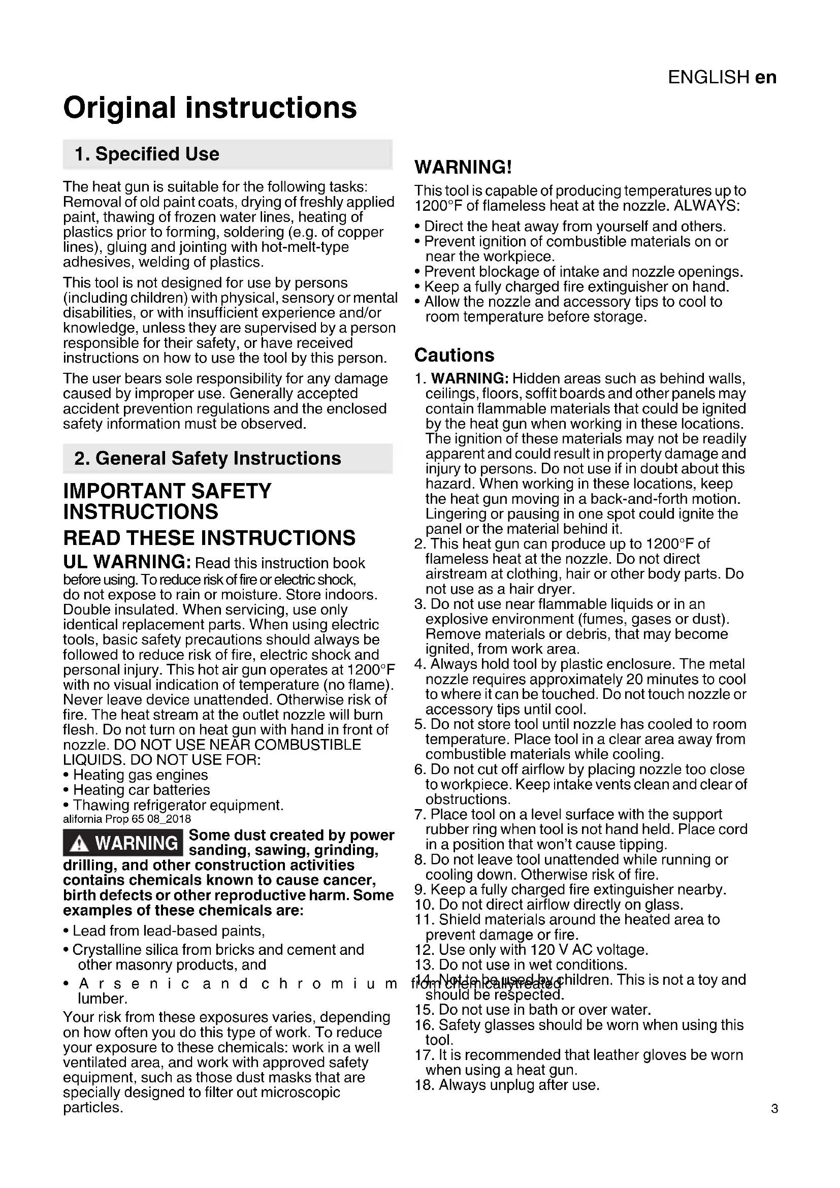 Original instructions The heat gun is suitable for the following tasks: Removal of old paint coats, drying of freshly applied paint, thawing of frozen water lines, heating of plastics prior to forming, soldering (e.g. of copper lines), gluing and jointing with hot-melt-type adhesives, welding of plastics. This tool is not designed for use by persons (including children) with physical, sensory or mental disabilities, or with insufficient experience and/or knowledge, unless they are supervised by a person responsible for their safety, or have received instructions on how to use the tool by this person. The user bears sole responsibility for any damage caused by improper use. Generally accepted accident prevention regulations and the enclosed safety information must be observed. IMPORTANT SAFETY INSTRUCTIONS
