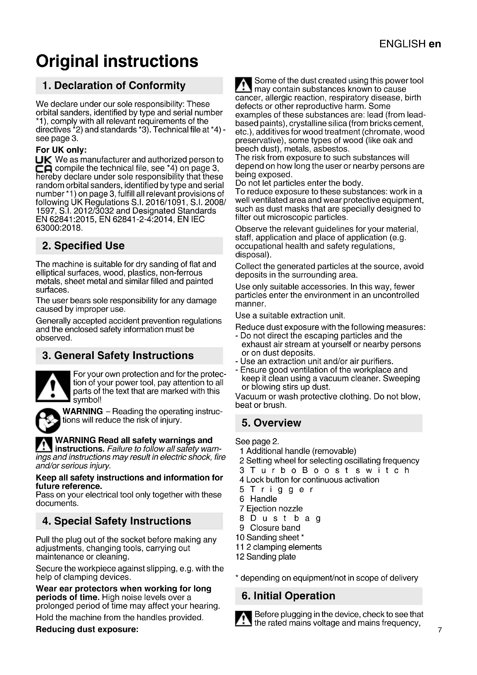 63000:2018. The machine is suitable for dry sanding of flat and elliptical surfaces, wood, plastics, non-ferrous metals, sheet metal and similar filled and painted surfaces. The user bears sole responsibility for any damage caused by improper use. Generally accepted accident prevention regulations and the enclosed safety information must be observed. For your own protection and for the protec- tion of your power tool, pay attention to all parts of the text that are marked with this symbol! WARNING – Reading the operating instruc- tions will reduce the risk of injury. WARNING Read all safety warnings and instructions. Failure to follow all safety warn- ings and instructions may result in electric shock, fire and/or serious injury. Keep all safety instructions and information for future reference. Pass on your electrical tool only together with these documents. Pull the plug out of the socket before making any adjustments, changing tools, carrying out maintenance or cleaning. Secure the workpiece against slipping, e.g. with the help of clamping devices. Wear ear protectors when working for long periods of time. High noise levels over a prolonged period of time may affect your hearing. Hold the machine from the handles provided. Reducing dust exposure: Some of the dust created using this power tool may contain substances known to cause cancer, allergic reaction, respiratory disease, birth defects or other reproductive harm. Some examples of these substances are: lead (from lead- based paints), crystalline silica (from bricks cement, etc.), additives for wood treatment (chromate, wood preservative), some types of wood (like oak and beech dust), metals, asbestos. The risk from exposure to such substances will depend on how long the user or nearby persons are being exposed. Do not let particles enter the body. To reduce exposure to these substances: work in a well ventilated area and wear protective equipment, such as dust masks that are specially designed to filter out microscopic particles. Observe the relevant guidelines for your material, staff, application and place of application (e.g. occupational health and safety regulations, disposal). Collect the generated particles at the source, avoid deposits in the surrounding area. Use only suitable accessories. In this way, fewer particles enter the environment in an uncontrolled manner. Use a suitable extraction unit. Reduce dust exposure with the following measures: - Do not direct the escaping particles and the exhaust air stream at yourself or nearby persons or on dust deposits. - Use an extraction unit and/or air purifiers. - Ensure good ventilation of the workplace and keep it clean using a vacuum cleaner. Sweeping or blowing stirs up dust. Vacuum or wash protective clothing. Do not blow, beat or brush. See page 2. 1 Additional handle (removable) 2 Setting wheel for selecting oscillating frequency 3TurboBoost switch 4 Lock button for continuous activation 5Trigger