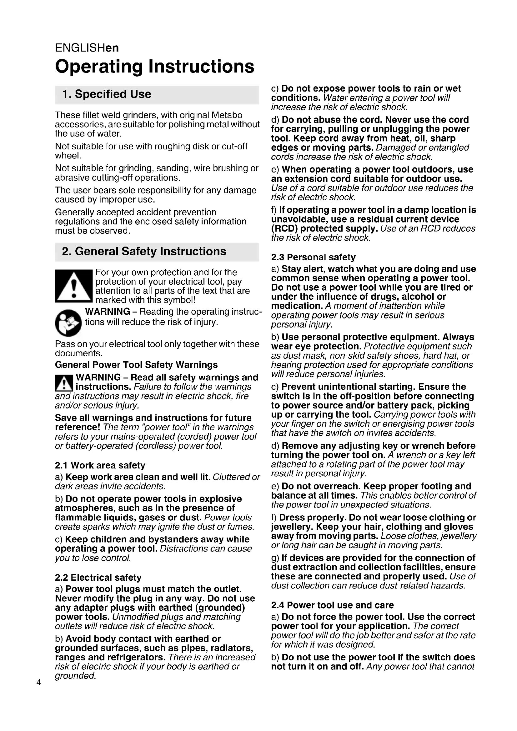 Operating Instructions These fillet weld grinders, with original Metabo accessories, are suitable for polishing metal without the use of water. Not suitable for use with roughing disk or cut-off wheel. Not suitable for grinding, sanding, wire brushing or abrasive cutting-off operations. The user bears sole responsibility for any damage caused by improper use. Generally accepted accident prevention regulations and the enclosed safety information must be observed. For your own protection and for the protection of your electrical tool, pay attention to all parts of the text that are marked with this symbol! WARNING – Reading the operating instruc- tions will reduce the risk of injury. Pass on your electrical tool only together with these documents. General Power Tool Safety Warnings WARNING – Read all safety warnings and instructions. Failure to follow the warnings and instructions may result in electric shock, fire and/or serious injury. Save all warnings and instructions for future reference! The term "power tool" in the warnings refers to your mains-operated (corded) power tool or battery-operated (cordless) power tool.