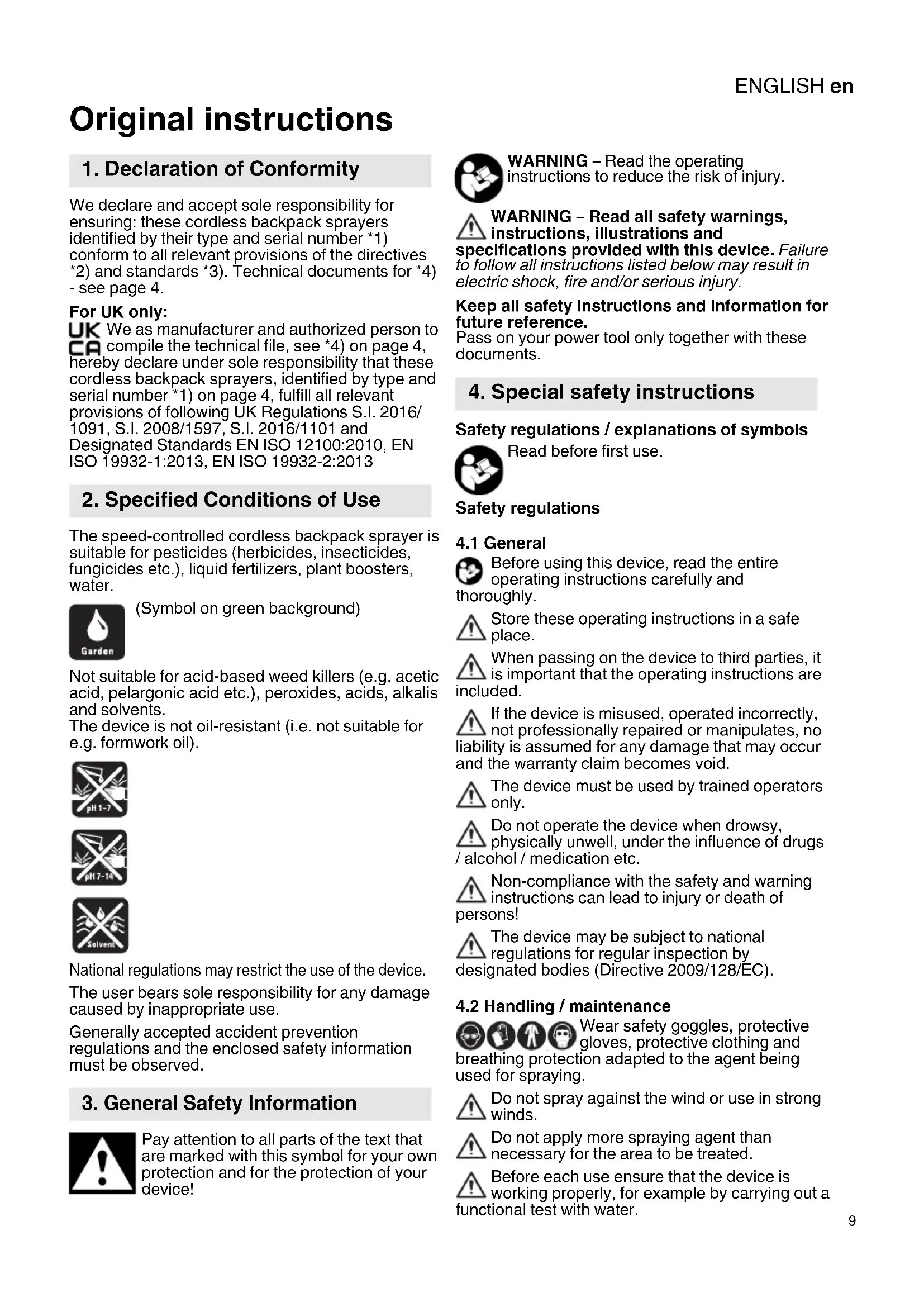 Original instructions We declare and accept sole responsibility for ensuring: these cordless backpack sprayers identified by their type and serial number *1) conform to all relevant provisions of the directives *2) and standards *3). Technical documents for *4) - see page 4. For UK only: We as manufacturer and authorized person to compile the technical file, see *4) on page 4, hereby declare under sole responsibility that these cordless backpack sprayers, identified by type and serial number *1) on page 4, fulfill all relevant provisions of following UK Regulations S.I. 2016/ 1091, S.I. 2008/1597, S.I. 2016/1101 and Designated Standards EN ISO 12100:2010, EN