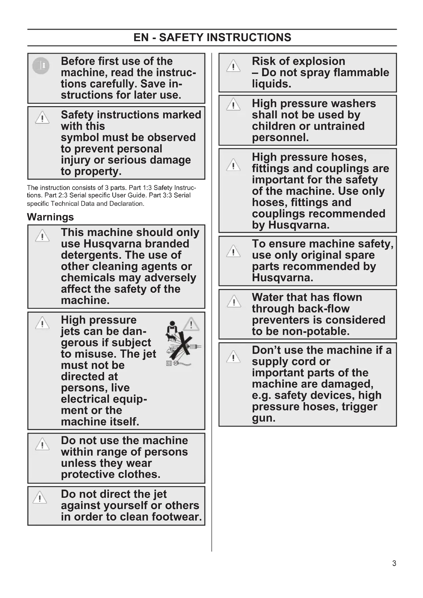 Before rst use of the machine, read the instruc- tions carefully. Save in- structions for later use. Safety instructions marked with this symbol must be observed to prevent personal injury or serious damage to property. The instruction consists of 3 parts. Part 1:3 Safety Instruc- tions. Part 2:3 Serial specic User Guide. Part 3:3 Serial specic Technical Data and Declaration. Warnings This machine should only use Husqvarna branded detergents. The use of other cleaning agents or chemicals may adversely affect the safety of the machine. High pressure jets can be dan- gerous if subject to misuse. The jet must not be directed at persons, live electrical equip- ment or the machine itself. Do not use the machine within range of persons unless they wear protective clothes. Do not direct the jet against yourself or others in order to clean footwear. Risk of explosion – Do not spray ammable liquids. High pressure washers shall not be used by children or untrained personnel. High pressure hoses, ttings and couplings are important for the safety of the machine. Use only hoses, ttings and couplings recommended by Husqvarna. To ensure machine safety, use only original spare parts recommended by Husqvarna. Water that has own through back-ow preventers is considered to be non-potable. Don’t use the machine if a supply cord or important parts of the machine are damaged, e.g. safety devices, high pressure hoses, trigger gun. OM 1-3 Safety FINAL rev 1 draft.indd 3 2017-06-14 13:59:254