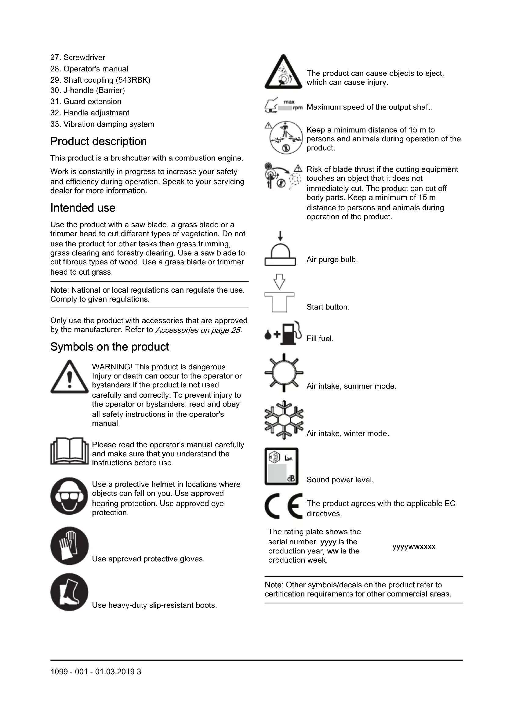 15 m Keep a minimum distance of 15 m to persons and animals during operation of the product. Risk of blade thrust if the cutting equipment touches an object that it does not immediately cut. The product can cut off body parts. Keep a minimum of 15 m distance to persons and animals during operation of the product. Air purge bulb. Start button. Fill fuel. Air intake, summer mode. Air intake, winter mode. Sound power level. The product agrees with the applicable EC directives. The rating plate shows the serial number. yyyy is the production year, ww is the production week. yyyywwxxxx Note: Other symbols/decals on the product refer to certification requirements for other commercial areas. 1099 - 001 - 01.03.2019 3EU V