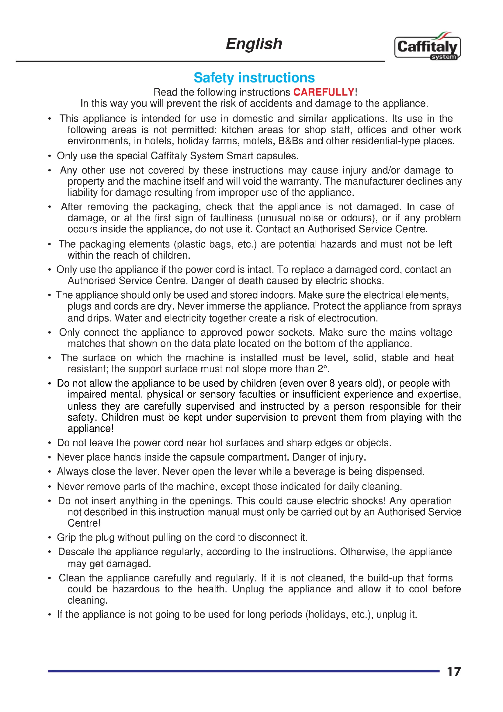 - Technical data .............................................................................................................. 2217 English Safety instructions Read the following instructions CAREFULLY! In this way you will prevent the risk of accidents and damage to the appliance.