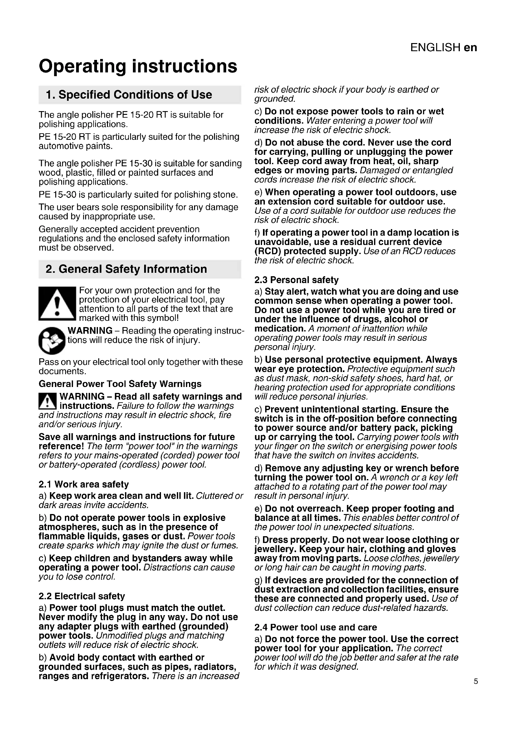 Operating instructions The angle polisher PE 15-20 RT is suitable for polishing applications. PE 15-20 RT is particularly suited for the polishing automotive paints. The angle polisher PE 15-30 is suitable for sanding wood, plastic, filled or painted surfaces and polishing applications. PE 15-30 is particularly suited for polishing stone. The user bears sole responsibility for any damage caused by inappropriate use. Generally accepted accident prevention regulations and the enclosed safety information must be observed. For your own protection and for the protection of your electrical tool, pay attention to all parts of the text that are marked with this symbol! WARNING – Reading the operating instruc- tions will reduce the risk of injury. Pass on your electrical tool only together with these documents. General Power Tool Safety Warnings WARNING – Read all safety warnings and instructions. Failure to follow the warnings and instructions may result in electric shock, fire and/or serious injury. Save all warnings and instructions for future reference! The term "power tool" in the warnings refers to your mains-operated (corded) power tool or battery-operated (cordless) power tool.