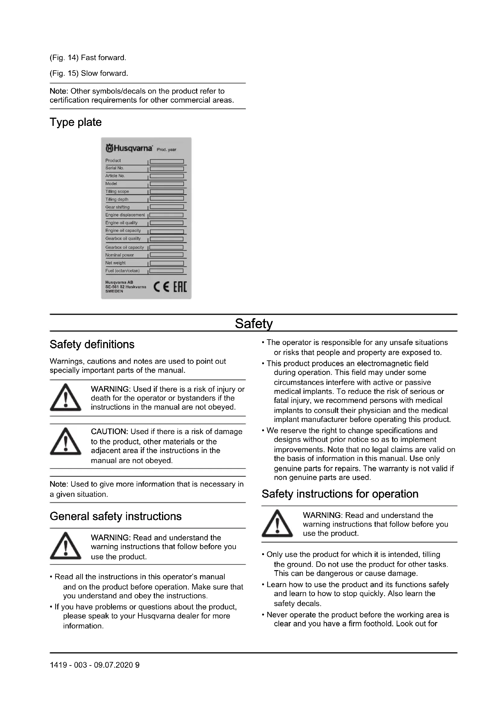 Symbols on the product (Fig. 3) WARNING: Be careful and use the product correctly. This product can cause serious injury or death to the operator or others. (Fig. 4) Read the operator's manual carefully and make sure that you understand the instructions before use. (Fig. 5) Use approved hearing protection and approved eye protection. (Fig. 6) This product applies with the applicable EC Directives. (Fig. 7) Fast. (Fig. 8) Slow. (Fig. 9) Stop the engine and remove the ignition cable before repairs or maintenance. (Fig. 10) Warning: Rotating parts. Keep hands and feet clear. (Fig. 11) Keep your distance! (Fig. 12) Neutral gear. (Fig. 13) Reverse gear. 8 1419 - 003 - 09.07.2020(Fig. 14) Fast forward. (Fig. 15) Slow forward. Note: Other symbols/decals on the product refer to certification requirements for other commercial areas. Type plate Husqvarna ABSE-561 82 HuskvarnaSWEDEN Serial No. Article No. Model Tilling scope Tilling depth Gear shifting Engine displacement Engine oil quality Engine oil capacity Gearbox oil quality Gearbox oil capacity Nominal power Net weight Fuel (octan/cetan) Product Safety Safety definitions Warnings, cautions and notes are used to point out specially important parts of the manual.