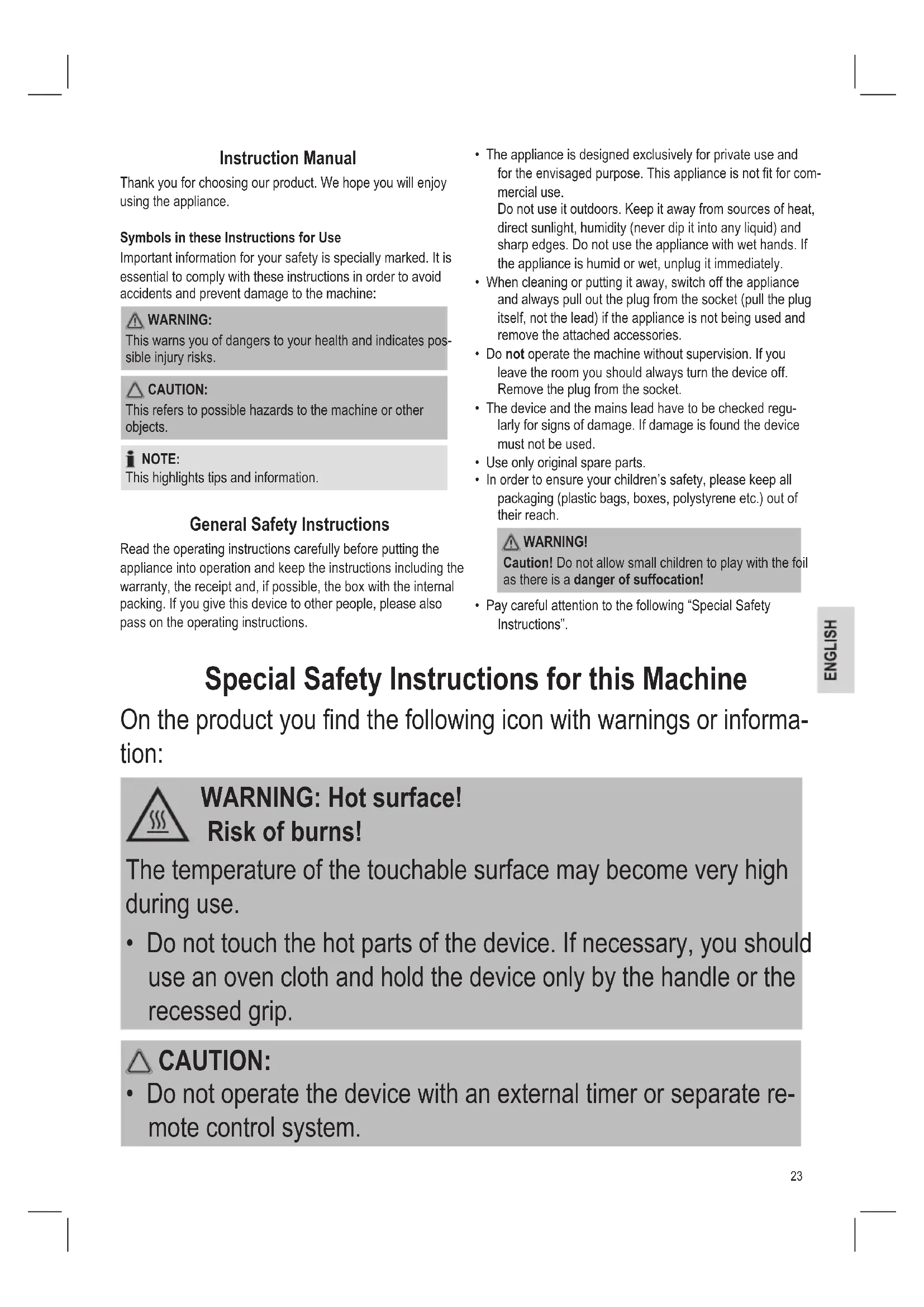 This warns you of dangers to your health and indicates pos- sible injury risks. CAUTION: This refers to possible hazards to the machine or other objects. NOTE: This highlights tips and information. General Safety Instructions Read the operating instructions carefully before putting the appliance into operation and keep the instructions including the warranty, the receipt and, if possible, the box with the internal packing. If you give this device to other people, please also pass on the operating instructions.