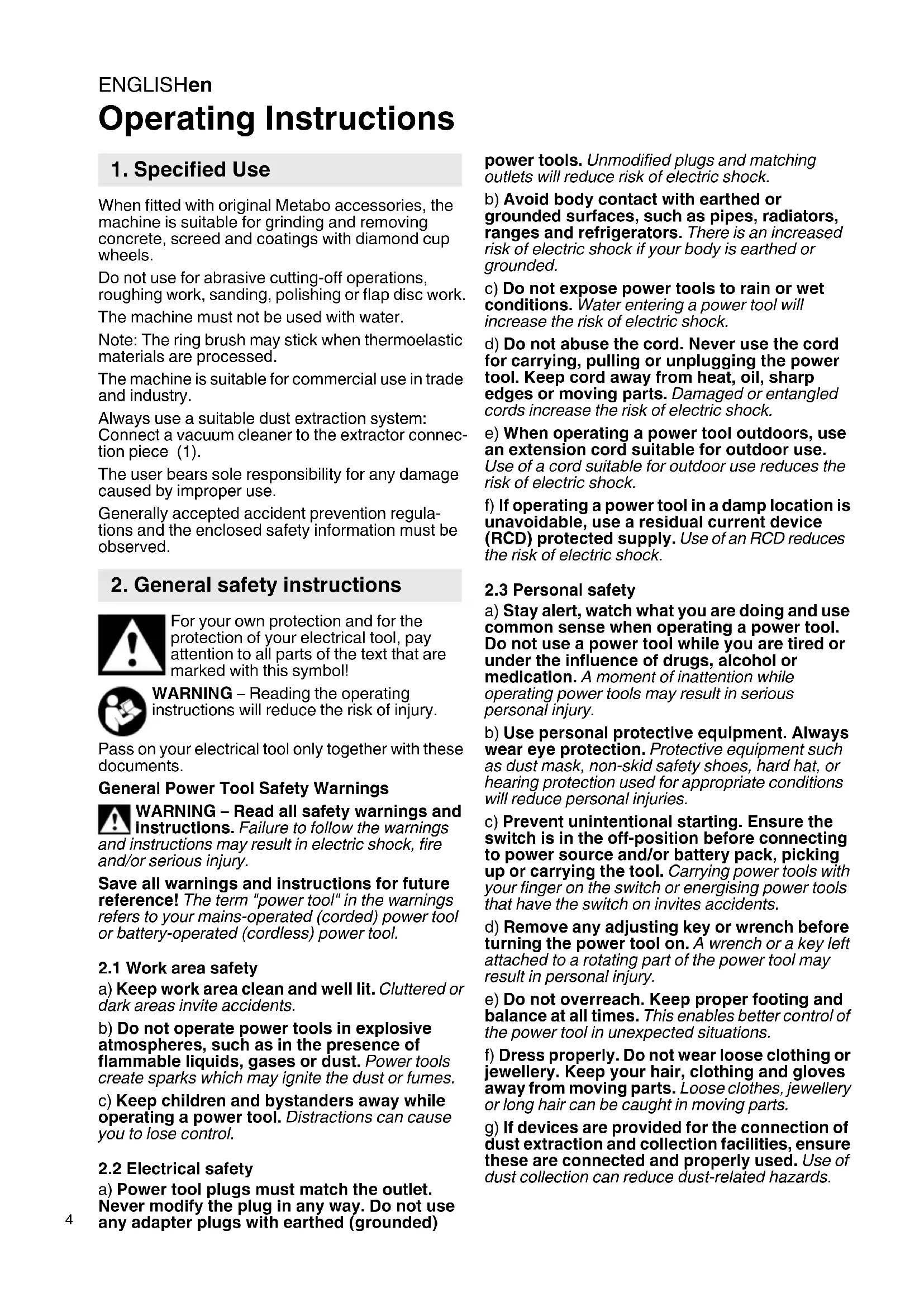 Operating Instructions When fitted with original Metabo accessories, the machine is suitable for grinding and removing concrete, screed and coatings with diamond cup wheels. Do not use for abrasive cutting-off operations, roughing work, sanding, polishing or flap disc work. The machine must not be used with water. Note: The ring brush may stick when thermoelastic materials are processed. The machine is suitable for commercial use in trade and industry. Always use a suitable dust extraction system: Connect a vacuum cleaner to the extractor connec- tion piece (1). The user bears sole responsibility for any damage caused by improper use. Generally accepted accident prevention regula- tions and the enclosed safety information must be observed. For your own protection and for the protection of your electrical tool, pay attention to all parts of the text that are marked with this symbol! WARNING – Reading the operating instructions will reduce the risk of injury. Pass on your electrical tool only together with these documents. General Power Tool Safety Warnings WARNING – Read all safety warnings and instructions. Failure to follow the warnings and instructions may result in electric shock, fire and/or serious injury. Save all warnings and instructions for future reference! The term "power tool" in the warnings refers to your mains-operated (corded) power tool or battery-operated (cordless) power tool.