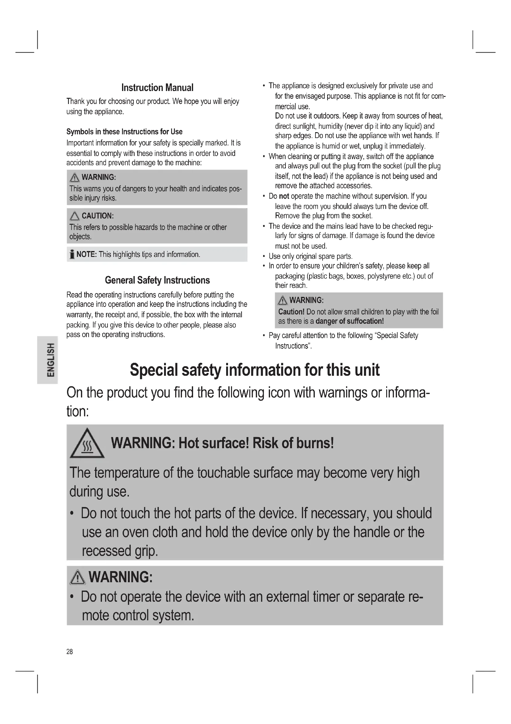 This warns you of dangers to your health and indicates pos- sible injury risks. CAUTION: This refers to possible hazards to the machine or other objects. NOTE: This highlights tips and information. General Safety Instructions Read the operating instructions carefully before putting the appliance into operation and keep the instructions including the warranty, the receipt and, if possible, the box with the internal packing. If you give this device to other people, please also pass on the operating instructions.
