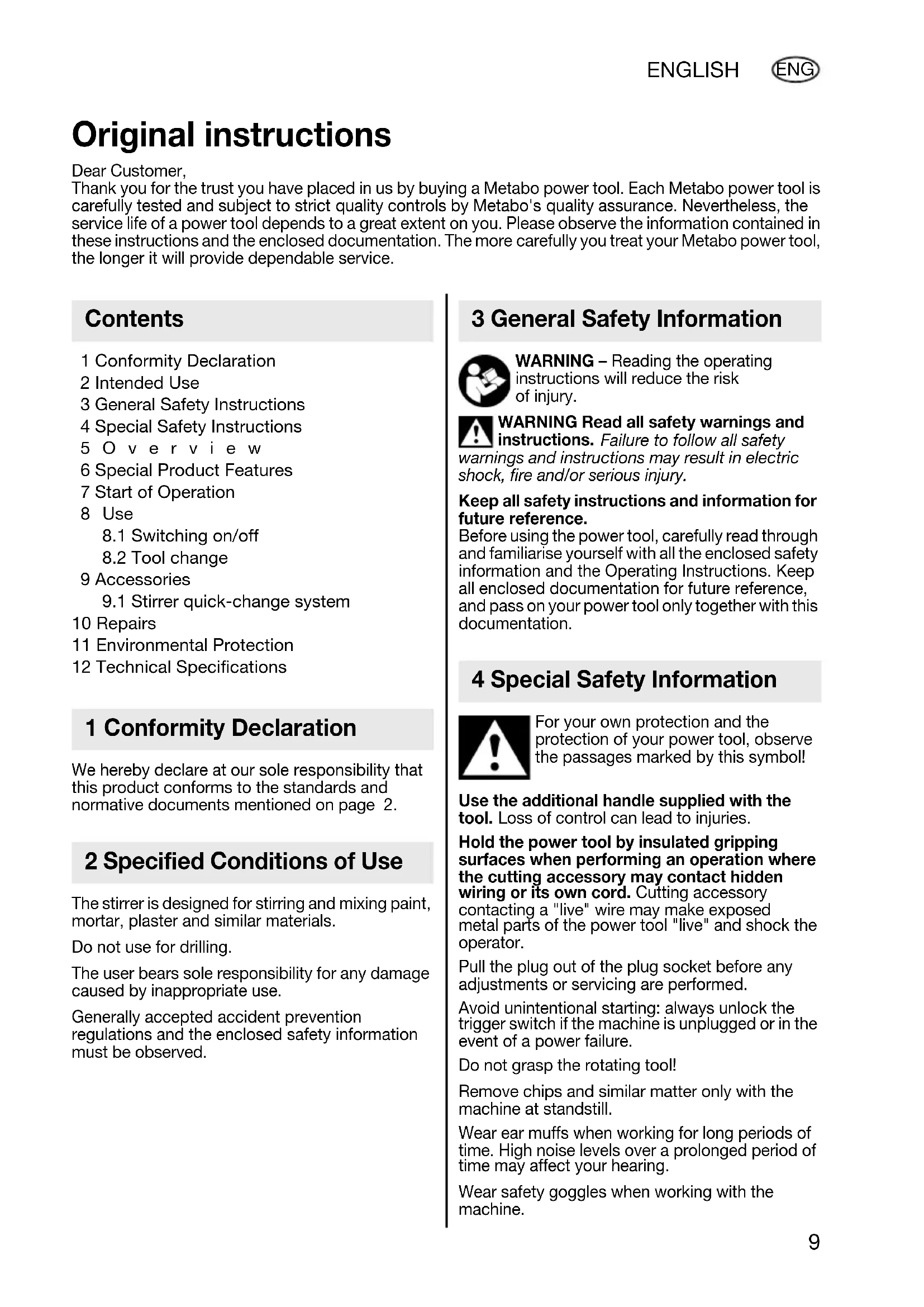 10 Repairs 11 Environmental Protection 12 Technical Specifications We hereby declare at our sole responsibility that this product conforms to the standards and normative documents mentioned on page 2. The stirrer is designed for stirring and mixing paint, mortar, plaster and similar materials. Do not use for drilling. The user bears sole responsibility for any damage caused by inappropriate use. Generally accepted accident prevention regulations and the enclosed safety information must be observed. WARNING – Reading the operating instructions will reduce the risk of injury. WARNING Read all safety warnings and instructions. Failure to follow all safety warnings and instructions may result in electric shock, fire and/or serious injury. Keep all safety instructions and information for future reference. Before using the power tool, carefully read through and familiarise yourself with all the enclosed safety information and the Operating Instructions. Keep all enclosed documentation for future reference, and pass on your power tool only together with this documentation. For your own protection and the protection of your power tool, observe the passages marked by this symbol! Use the additional handle supplied with the tool. Loss of control can lead to injuries. Hold the power tool by insulated gripping surfaces when performing an operation where the cutting accessory may contact hidden wiring or its own cord. Cutting accessory contacting a "live" wire may make exposed metal parts of the power tool "live" and shock the operator. Pull the plug out of the plug socket before any adjustments or servicing are performed. Avoid unintentional starting: always unlock the trigger switch if the machine is unplugged or in the event of a power failure. Do not grasp the rotating tool! Remove chips and similar matter only with the machine at standstill. Wear ear muffs when working for long periods of time. High noise levels over a prolonged period of time may affect your hearing. Wear safety goggles when working with the machine. Original instructions Dear Customer, Thank you for the trust you have placed in us by buying a Metabo power tool. Each Metabo power tool is carefully tested and subject to strict quality controls by Metabo's quality assurance. Nevertheless, the service life of a power tool depends to a great extent on you. Please observe the information contained in these instructions and the enclosed documentation. The more carefully you treat your Metabo power tool, the longer it will provide dependable service. Contents 1 Conformity Declaration 2 Specified Conditions of Use 3 General Safety Information 4 Special Safety Information 17026753_0513 RWE 1100.book Seite 9 Dienstag, 7. Mai 2013 10:49 1010 ENGLISH ENG Paints and lacquers may contain solvents that give off dangerous fumes and explosive mixtures when they are applied. Good ventilation or extraction must therefore be ensured. Dust from material such as paint containing lead, some wood species, minerals and metal may be harmful. Contact with or inhalation of the dust may cause allergic reactions and/or respiratory diseases to the operator or bystanders. Certain kinds of dust are classified as carcinogenic such as oak and beech dust especially in conjunc- tion with additives for wood conditioning (chro- mate, wood preservative). Material containing asbestos must only be treated by specialists. - Where the use of a dust extraction device is possible it shall be used. - The work place must be well ventilated. - The use of a dust mask of filter class P2 is recommended. Follow national requirements for the materials you want to work with. See page 3. 1 Side handle 2 Lock button 3Trigger Turn-off carbon brushes: If the brushes are worn out, the machine switches off automatically. Before plugging in check to see that the rated mains voltage and mains frequency, as stated on the rating label, match with your power supply. Australia: Always use a residual current device (RCD) protected supply with a rated residual current of 30 mA or less.