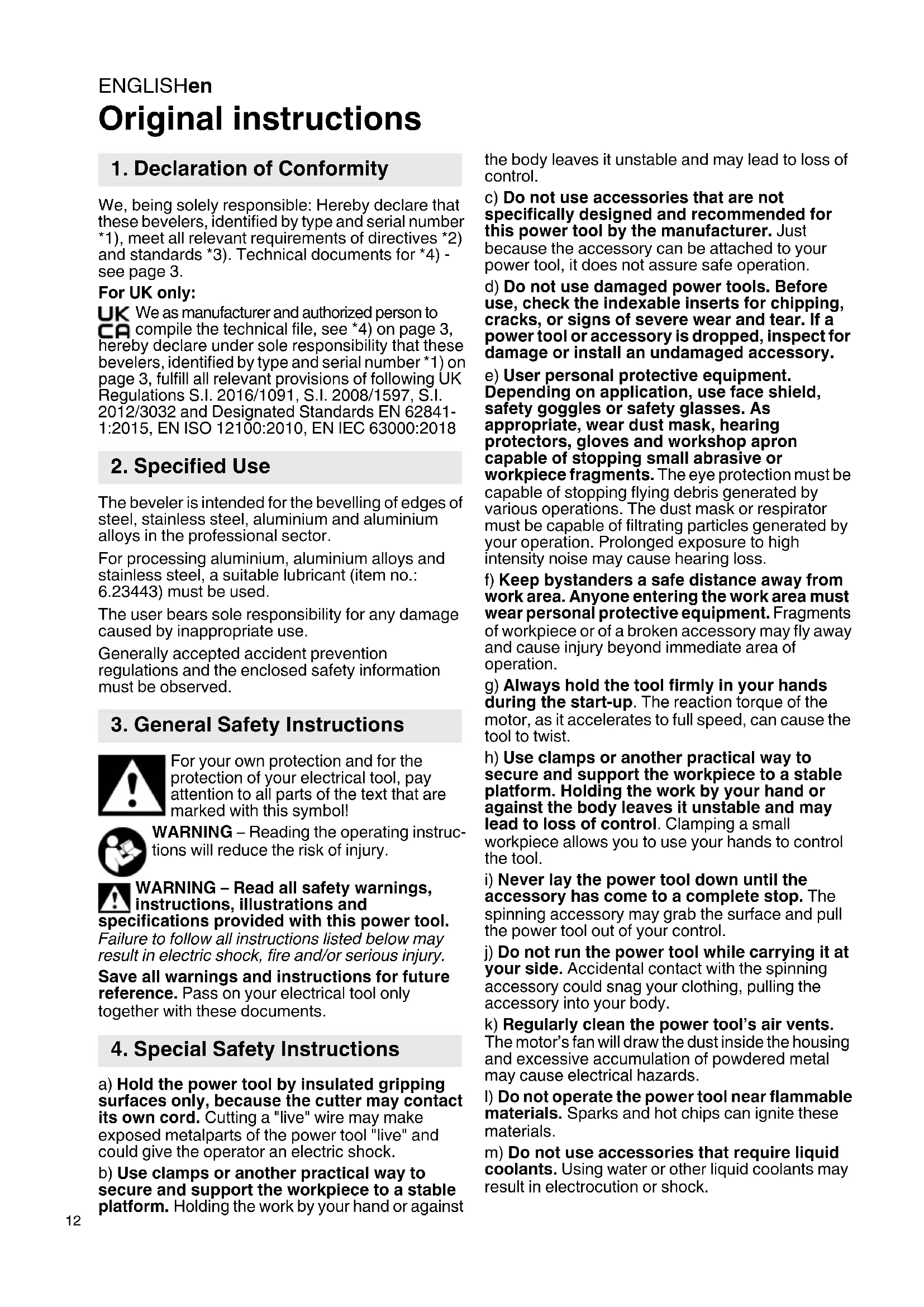 The beveler is intended for the bevelling of edges of steel, stainless steel, aluminium and aluminium alloys in the professional sector. For processing aluminium, aluminium alloys and stainless steel, a suitable lubricant (item no.: 6.23443) must be used. The user bears sole responsibility for any damage caused by inappropriate use. Generally accepted accident prevention regulations and the enclosed safety information must be observed. For your own protection and for the protection of your electrical tool, pay attention to all parts of the text that are marked with this symbol! WARNING – Reading the operating instruc- tions will reduce the risk of injury. WARNING – Read all safety warnings, instructions, illustrations and specifications provided with this power tool. Failure to follow all instructions listed below may result in electric shock, fire and/or serious injury. Save all warnings and instructions for future reference. Pass on your electrical tool only together with these documents. a) Hold the power tool by insulated gripping surfaces only, because the cutter may contact its own cord. Cutting a "live" wire may make exposed metalparts of the power tool "live" and could give the operator an electric shock. b) Use clamps or another practical way to secure and support the workpiece to a stable platform. Holding the work by your hand or against the body leaves it unstable and may lead to loss of control. c) Do not use accessories that are not specifically designed and recommended for this power tool by the manufacturer. Just because the accessory can be attached to your power tool, it does not assure safe operation. d) Do not use damaged power tools. Before use, check the indexable inserts for chipping, cracks, or signs of severe wear and tear. If a power tool or accessory is dropped, inspect for damage or install an undamaged accessory. e) User personal protective equipment. Depending on application, use face shield, safety goggles or safety glasses. As appropriate, wear dust mask, hearing protectors, gloves and workshop apron capable of stopping small abrasive or workpiece fragments. The eye protection must be capable of stopping flying debris generated by various operations. The dust mask or respirator must be capable of filtrating particles generated by your operation. Prolonged exposure to high intensity noise may cause hearing loss. f) Keep bystanders a safe distance away from work area. Anyone entering the work area must wear personal protective equipment. Fragments of workpiece or of a broken accessory may fly away and cause injury beyond immediate area of operation. g) Always hold the tool firmly in your hands during the start-up. The reaction torque of the motor, as it accelerates to full speed, can cause the tool to twist. h) Use clamps or another practical way to secure and support the workpiece to a stable platform. Holding the work by your hand or against the body leaves it unstable and may lead to loss of control. Clamping a small workpiece allows you to use your hands to control the tool.