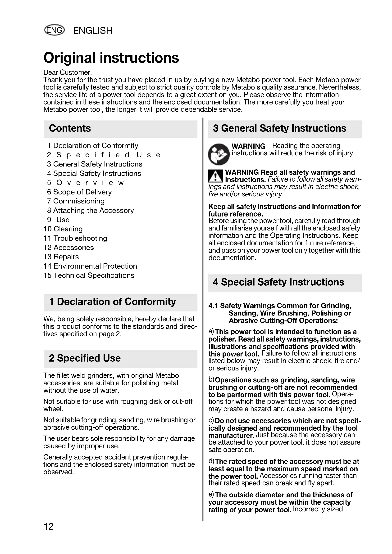 pA/WA = Unsicherheit (Schallpegel) Beim Arbeiten kann der Geräuschpegel 80 dB(A) überschreiten. Gehörschutz tragen! Messwerte ermittelt gemäß EN 60745. Die angegebenen technischen Daten sind toleranzbehaftet (entsprechend den jeweils gültigen Standards). 17027055_0411 KNS 18 LTX 150.book Seite 11 Dienstag, 26. April 2011 2:46 1412 ENGLISH ENG 1 Declaration of Conformity 2Specified Use 3 General Safety Instructions 4 Special Safety Instructions 5Overview 6 Scope of Delivery 7 Commissioning 8 Attaching the Accessory 9Use 10 Cleaning 11 Troubleshooting 12 Accessories 13 Repairs 14 Environmental Protection 15 Technical Specifications We, being solely responsible, hereby declare that this product conforms to the standards and direc- tives specified on page 2. The fillet weld grinders, with original Metabo accessories, are suitable for polishing metal without the use of water. Not suitable for use with roughing disk or cut-off wheel. Not suitable for grinding, sanding, wire brushing or abrasive cutting-off operations. The user bears sole responsibility for any damage caused by improper use. Generally accepted accident prevention regula- tions and the enclosed safety information must be observed. WARNING – Reading the operating instructions will reduce the risk of injury. WARNING Read all safety warnings and instructions. Failure to follow all safety warn- ings and instructions may result in electric shock, fire and/or serious injury. Keep all safety instructions and information for future reference. Before using the power tool, carefully read through and familiarise yourself with all the enclosed safety information and the Operating Instructions. Keep all enclosed documentation for future reference, and pass on your power tool only together with this documentation.