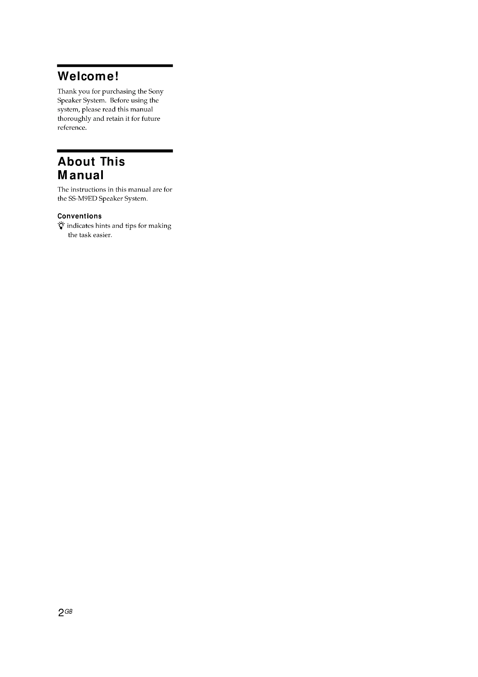 Welcome! Thank you for purchasing the Sony Speaker System. Before using the system, please read this manual thoroughly and retain it for future reference. About This Manual The instructions in this manual are for the SS-M9ED Speaker System. Conventions z indicates hints and tips for making the task easier.3