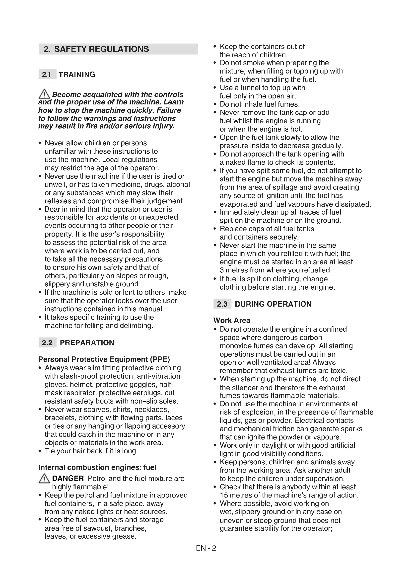 - Tie your hair back if it is long. Internal combustion engines: fuel DANGER! Petrol and the fuel mixture are highly ammable!
