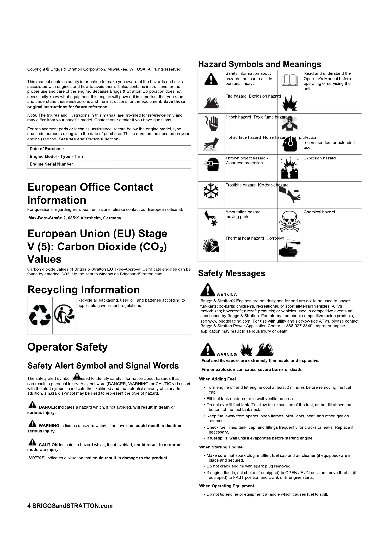 Recycle all packaging, used oil, and batteries according to applicable government regulations. Operator Safety Safety Alert Symbol and Signal Words The safety alert symbol ( ) is used to identify safety information about hazards that can result in personal injury. A signal word (DANGER, WARNING, or CAUTION) is used with the alert symbol to indicate the likelihood and the potential severity of injury. In addition, a hazard symbol may be used to represent the type of hazard. DANGERindicates a hazard which, if not avoided,will result in death or serious injury. WARNINGindicates a hazard which, if not avoided,could result in death or serious injury. CAUTIONindicates a hazard which, if not avoided,could result in minor or moderate injury. NOTICEindicates a situation thatcould result in damage to the product. Hazard Symbols and Meanings Safety information about hazards that can result in personal injury. Read and understand the Operator's Manual before operating or servicing the unit. Fire hazard Explosion hazard Shock hazard Toxic fume hazard Hot surface hazard Noise hazard - Ear protection recommended for extended use. Thrown object hazard - Wear eye protection. Explosion hazard Frostbite hazard Kickback hazard Amputation hazard - moving parts Chemical hazard Thermal heat hazard Corrosive Safety Messages WARNING Briggs & Stratton® Engines are not designed for and are not to be used to power: fun-karts; go-karts; children's, recreational, or sport all-terrain vehicles (ATVs); motorbikes; hovercraft; aircraft products; or vehicles used in competitive events not sanctioned by Briggs & Stratton. For information about competitive racing products, see www.briggsracing.com. For use with utility and side-by-side ATVs, please contact Briggs & Stratton Power Application Center, 1-866-927-3349. Improper engine application may result in serious injury or death. WARNING Fuel and its vapors are extremely flammable and explosive. Fire or explosion can cause severe burns or death. When Adding Fuel