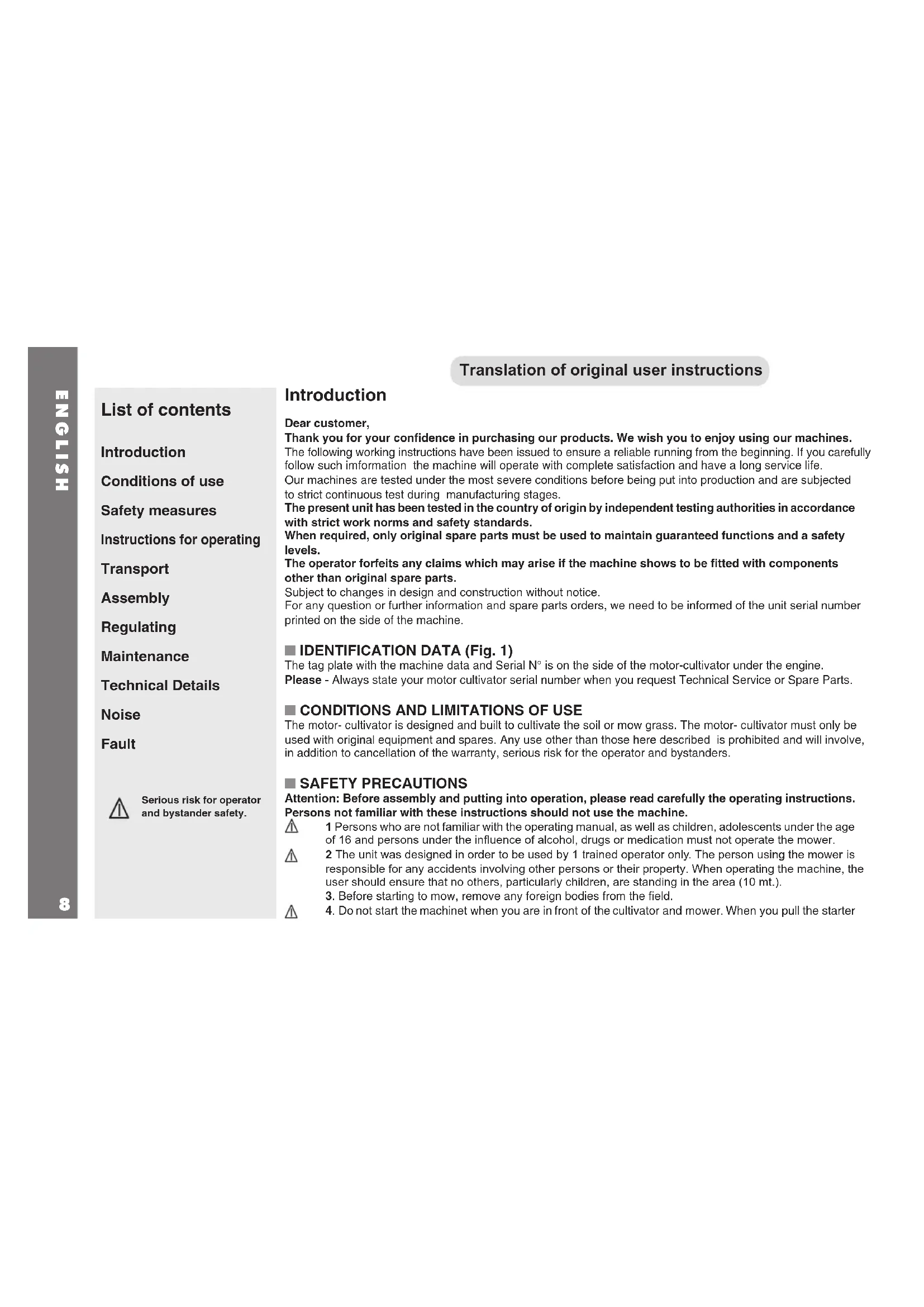 14. Please note that our company assumes no responsibility for damages due to: a) repairs made by unspecialized personnel or unauthorized after-sales service centers, or b) use of other than ORIGINAL SPARE PARTS. The same conditions apply to the accessories. n INSTRUCTIONS FOR OPERATING n INSTRUCTIONS - MOTOR Please follow the motor manufacturer’s operating instructions. n PUTTING INTO OPERATION Make sure, operating levers are in “off” position. Put throttle into “start” position. Pull on the engine starter handle until you feel the resistance due to compression, let the starter rope run back slowly, and then give it a hefty pull (a full arm’s length) to start the engine. Keep hold of the starter handle and let the rope run back slowly. To stop: Put the accelerator lever into STOP position. n SAFETY FEATURE All motor-cultivators are provided with a safety feature which acts. The device causes the transmission to disconnect automatically anytime the respective control lever is released. n TRANSPORT A forklift truck should be used to move the machine. The forks should be opened as far as possible and inserted into the pallet. The weight of the machine is given on the Manufacturer’s data plate together with the other technical information. n HOW TO ASSEMBLE YOUR MOTOR-CULTIVATOR Unless otherwise agreed, the motor-cultivator is delivered disassembled and placed in a packing case. For assembly to be completed, the step by step procedure is as follows. n INSTALLING THE HANDLEBARS (Fig. 2) Fix the handlebars (Fig. 2, detail 1) to its mount (2) using screws (3). Important! The larger ENGLISH 9diameter washers must be installed by the slots. Adjust handlebar height with its xing screws (3). Position the gear lever (4) putting though its guide (5) and push the tip into the hole on the swivel (6) and clamp it with safety pin (7). n HOW TO MOUNT THE ACCELERATOR WIRE (provided with metal sheath) Fig. 3 Position the lever (g. 3, item 1) on the engine at the end of its stroke as shown by arrow “A “ in the gure. Move the throttle lever(2) on the handlebar to the end of its stroke as shown by arrow “B “ in the gure. Insert wire (3) into hole (4), secure the sheath (5) with retainer (6) and screw (7). The throttle wire must be xed to the engine at the sparkplug side. ATTENTION: in the position “stop” the throttle lever must stop engine. n BELT STRETCHER DRIVING WIRE (Fig. 4) The driving cable (1) is already linked to the belt stretcher lever of the frame to the lever (2). Please tighten the lever (2) on the handlebar using the screw (3) you can nd into the loose parts bag. n ATTACHMENTS ASSEMBLY (Fig. 5) The cultivator has a quick couple for attachments. Assemble the belt on the upper pulley A with the following attachments : grassland mower and rotavator. Assemble the belt on the lower pulley B with the following attachments : brush and cutting bar. n ATTACHING THE MOWER BAR (Fig. 6a) The cultivator has a quick couple for attachments. The motor should be shut down and the machine horizontal. Insert the cutter bar pin (1) halfway into its seating (2). Install the belt (3) in its pulley by moving the guide pin all the way to the end of its travel. Position 1 and 2 : turn the handle (13) until you are able to couple the spring (14) to the connection (15) . Position 2 and 3 : to complete the above coupling , rotate the handle (13) in the opposite direction until you are able to tension the spring (14). Replace the cowling (6) with its centering pin (7) and the threaded pin (8). Tighten home the nut with its washer on the cowling. n ATTACHING THE CULTIVATOR (Fig. 6b) The cultivator has a quick couple for attachments. The engine must be switched off and the machine on level ground. Insert the cultivator pin (1) halfway into its seating (2). Install the belt (3) in the appropriate pulley and push the pin (1) all the way in. Position 1 and 2 : turn the handle (13) until you are able to couple the spring (14) into the slot (15) . Position 2 and 3 : to complete the above coupling , rotate the handle (13) in the opposite direction until you are able to tension the spring (14). Install the cover (6) using its centering screw (7). The reverse gear blocking lever (8) will be correctly positioned with the gear lever (9). Tighten home the nut and its washer to x the cover (6) n REVERSING ROD ASSEMBLING (Fig. 12) Connect the extremity of the rod (2) in the hole of the lever (3), so lock with the R-shape pin. n ATTACHMENT DRIVE BELT REGISTRATION (Fig. 7) To increase belt tensioning between machine and attachment, use the register (2) so that the attachment begins to work only when the control lever has been moved more than halfway its travel (Fig. 7) If a mower is attached, to increase the tension on the two bottom mower drive belts, slacken off nut (9) and remove the washers between the half-pulleys (Fig. 5). If a cultivator is attached, check belt tension after two work hours (3, Fig. 6). n HOW TO OPERATE THE DRIVE OF THE CUTTING BLADE (Fig. 7): disconnect the safety lever (3), then push down the lever for the tool insert (4). ENGLISH 10n BELT-STRETCHER CONTROL ADJUSTMENT ( Fig. 8) Warning - Tyres should start rotating only when control lever is beyond halftravel. When lever is pulled to full extent (working position), the belt-stretcher load spring (2) should extend by 6 to 8 mm approx. For above described conditions be reached, action is to be taken on nut (1) set close to the belt stretcher control assembly. n REGULATING THE HANDLEBAR The handlebar can be height or side adjusted. Before beginning any work, it is good standard operating procedure to adjust the handlebar to the needs of the operator so that the machine can be easily manoeuvered at all times. The handlebar can be side adjusted so that the operator can use the machine without treading in the soft ground or damaging the crop. n HANDLEBAR SIDE ADJUSTMENT (Fig. 2) There are three positions for the handlebar side adjustment and thes