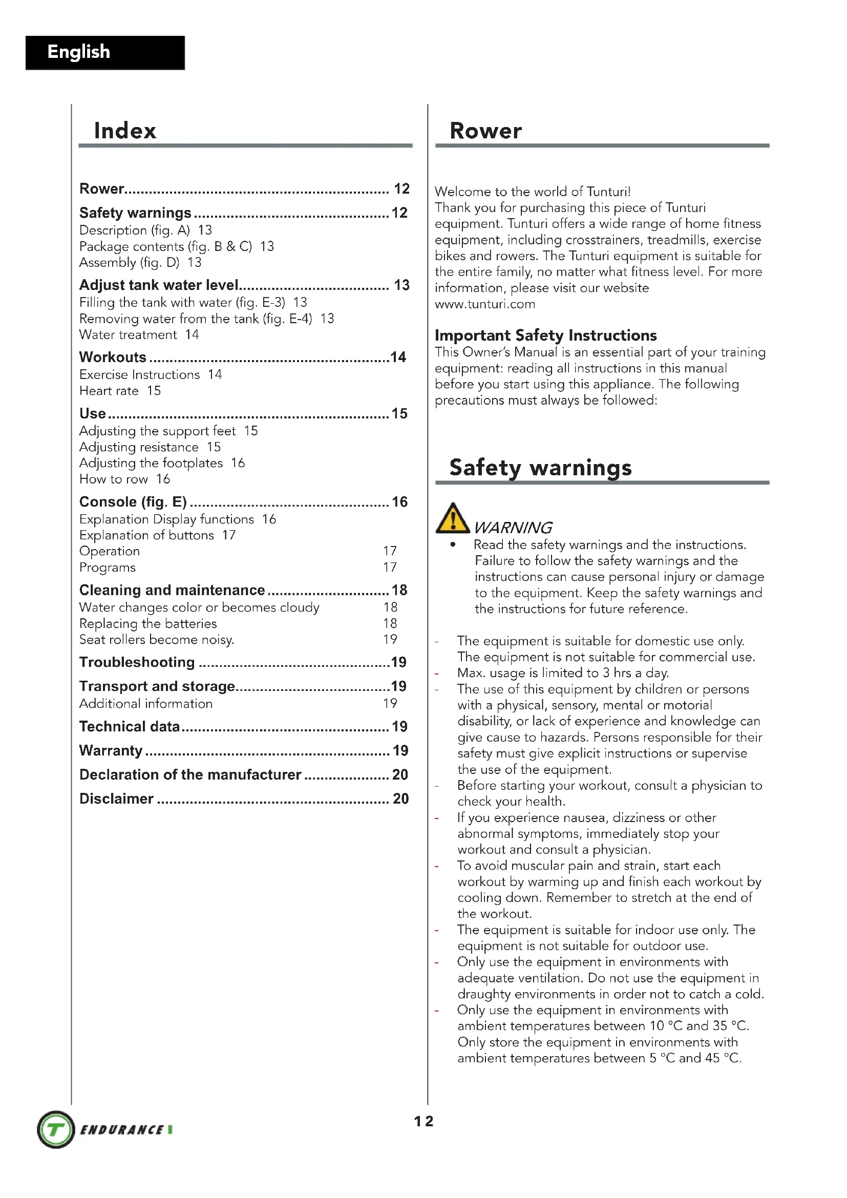 - Disclaimer Rower Welcome to the world of Tunturi!Thank you for purchasing this piece of Tunturi equipment. Tunturi offers a wide range of home fitness equipment, including crosstrainers, treadmills, exercise bikes and rowers. The Tunturi equipment is suitable for the entire family, no matter what fitness level. For more information, please visit our website www.tunturi.com Important Safety Instructions This Owner’s Manual is an essential part of your training equipment: reading all instructions in this manual before you start using this appliance. The following precautions must always be followed: Safety warnings WARNING p. 20