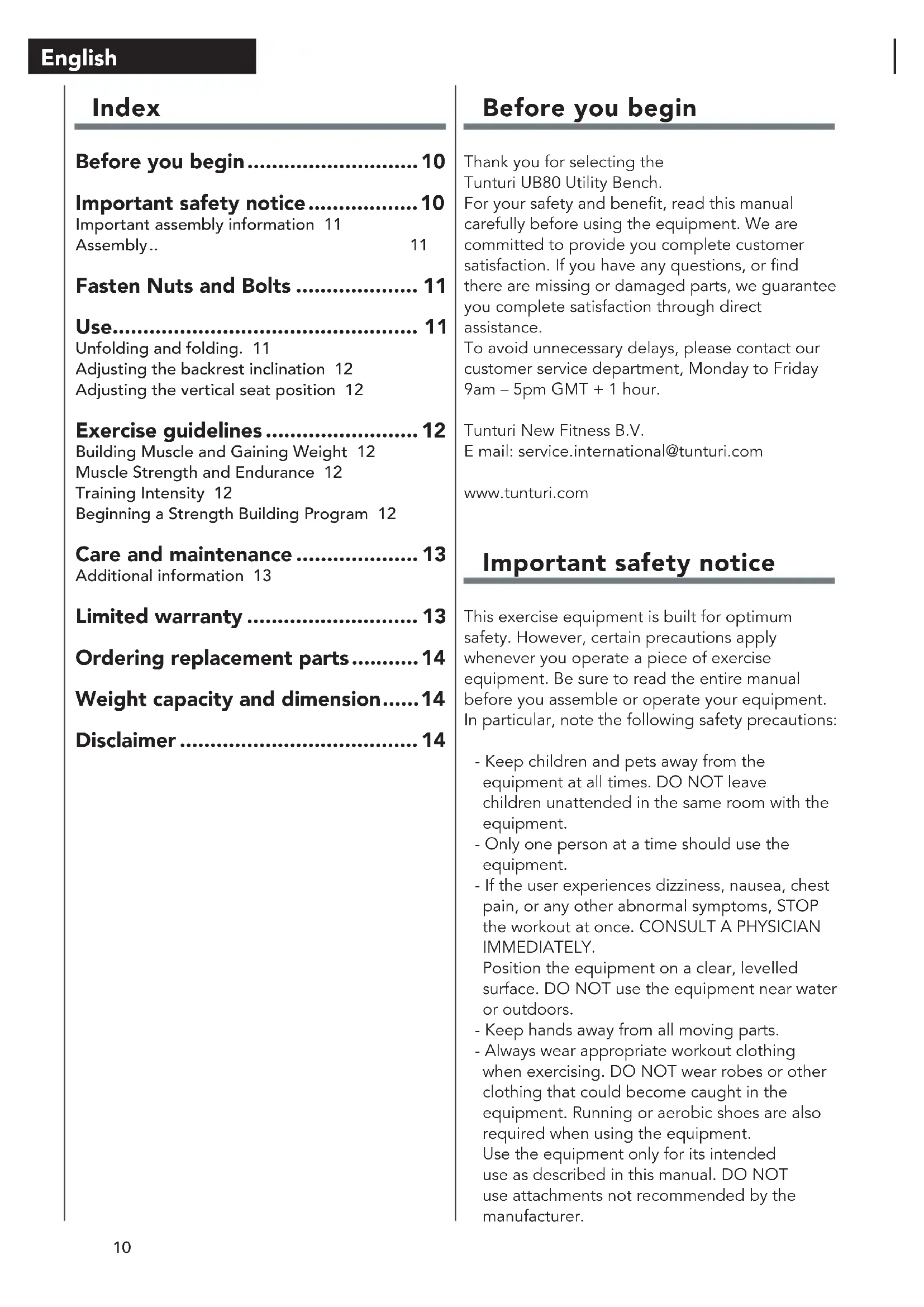 - English Before you begin Thank you for selecting the Tunturi UB80 Utility Bench. For your safety and benefit, read this manual carefully before using the equipment. We are committed to provide you complete customer satisfaction. If you have any questions, or find there are missing or damaged parts, we guarantee you complete satisfaction through direct assistance. To avoid unnecessary delays, please contact our customer service department, Monday to Friday 9am – 5pm GMT + 1 hour. Tunturi New Fitness B.V. E mail: service.international@tunturi.com www.tunturi.com Important safety notice This exercise equipment is built for optimum safety. However, certain precautions apply whenever you operate a piece of exercise equipment. Be sure to read the entire manual before you assemble or operate your equipment. In particular, note the following safety precautions: - Keep children and pets away from the equipment at all times. DO NOT leave children unattended in the same room with the equipment. - Only one person at a time should use the equipment. - If the user experiences dizziness, nausea, chest pain, or any other abnormal symptoms, STOP the workout at once. CONSULT A PHYSICIAN IMMEDIATELY. Position the equipment on a clear, levelled surface. DO NOT use the equipment near water or outdoors. - Keep hands away from all moving parts. - Always wear appropriate workout clothing when exercising. DO NOT wear robes or other clothing that could become caught in the equipment. Running or aerobic shoes are also required when using the equipment. Use the equipment only for its intended use as described in this manual. DO NOT use attachments not recommended by the manufacturer. Index Before you begin p. 10