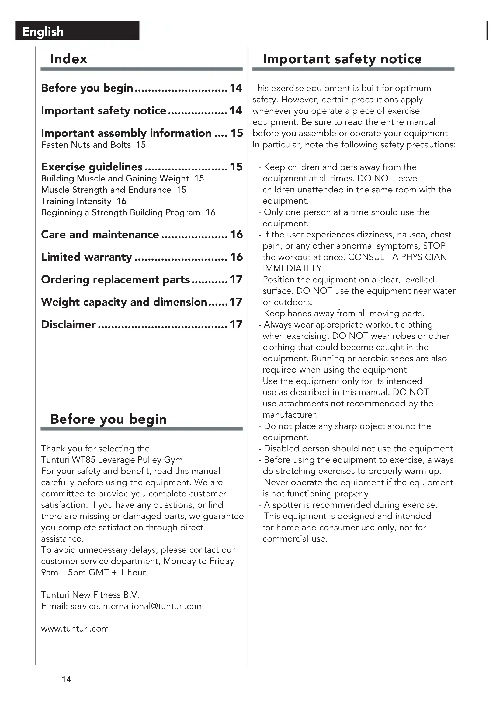 - English Before you begin Thank you for selecting the Tunturi WT85 Leverage Pulley Gym For your safety and benefit, read this manual carefully before using the equipment. We are committed to provide you complete customer satisfaction. If you have any questions, or find there are missing or damaged parts, we guarantee you complete satisfaction through direct assistance. To avoid unnecessary delays, please contact our customer service department, Monday to Friday 9am – 5pm GMT + 1 hour. Tunturi New Fitness B.V. E mail: service.international@tunturi.com www.tunturi.com Important safety notice This exercise equipment is built for optimum safety. However, certain precautions apply whenever you operate a piece of exercise equipment. Be sure to read the entire manual before you assemble or operate your equipment. In particular, note the following safety precautions: - Keep children and pets away from the equipment at all times. DO NOT leave children unattended in the same room with the equipment. - Only one person at a time should use the equipment. - If the user experiences dizziness, nausea, chest pain, or any other abnormal symptoms, STOP the workout at once. CONSULT A PHYSICIAN IMMEDIATELY. Position the equipment on a clear, levelled surface. DO NOT use the equipment near water or outdoors. - Keep hands away from all moving parts. - Always wear appropriate workout clothing when exercising. DO NOT wear robes or other clothing that could become caught in the equipment. Running or aerobic shoes are also required when using the equipment. Use the equipment only for its intended use as described in this manual. DO NOT use attachments not recommended by the manufacturer. - Do not place any sharp object around the equipment. - Disabled person should not use the equipment. - Before using the equipment to exercise, always do stretching exercises to properly warm up. - Never operate the equipment if the equipment is not functioning properly. - A spotter is recommended during exercise. - This equipment is designed and intended for home and consumer use only, not for commercial use. Index Before you begin p. 14