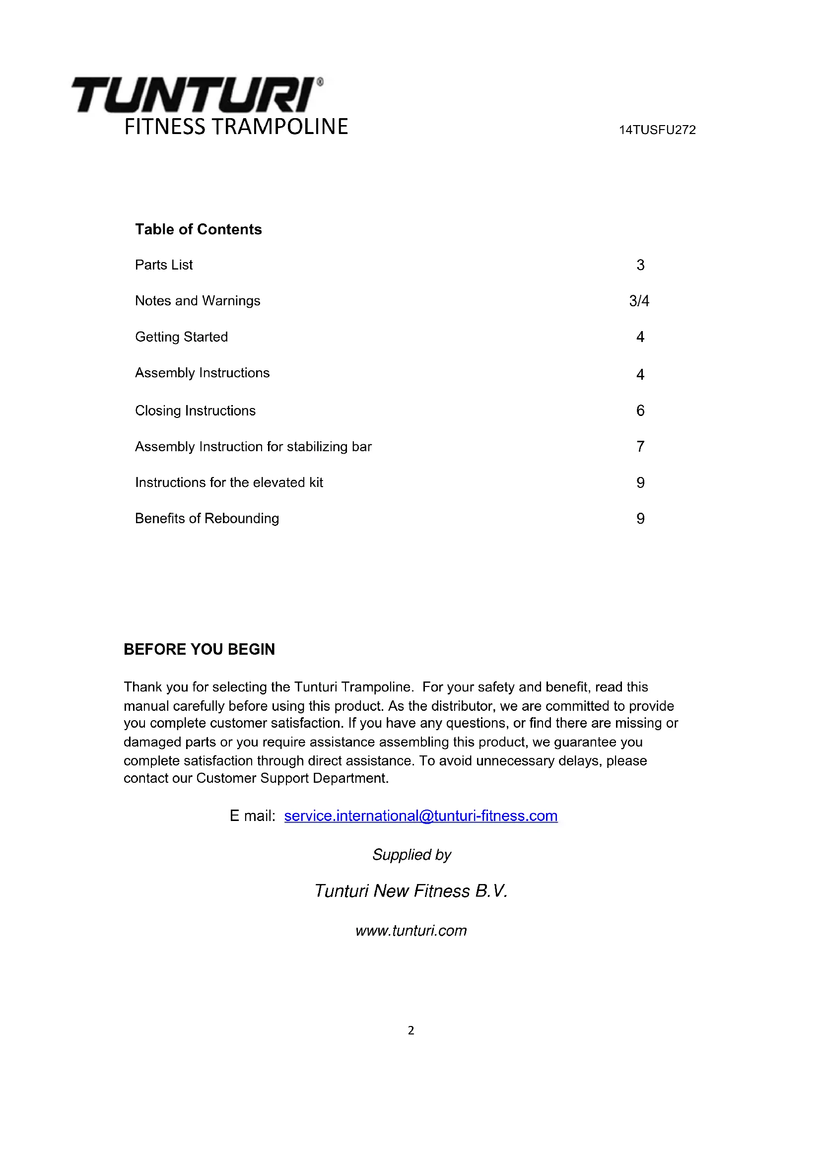 Thank you for selecting the Tunturi Trampoline. For your safety and benefit, read this manual carefully before using this product. As the distributor, we are committed to provide you complete customer satisfaction. If you have any questions, or find there are missing or damaged parts or you require assistance assembling this product, we guarantee you complete satisfaction through direct assistance. To avoid unnecessary delays, please contact our Customer Support Department. E mail: service.international@tunturi-fitness.com Supplied by Tunturi New Fitness B.V. www.tunturi.comFITNESSTRAMPOLINE 14TUSFU272