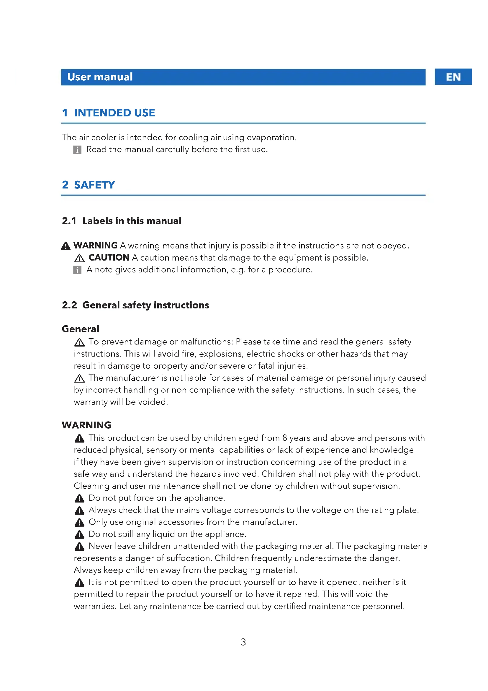 User manual 1 INTENDED USE The air cooler is intended for cooling air using evaporation. 5 Read the manual carefully before the first use. 2 SAFETY