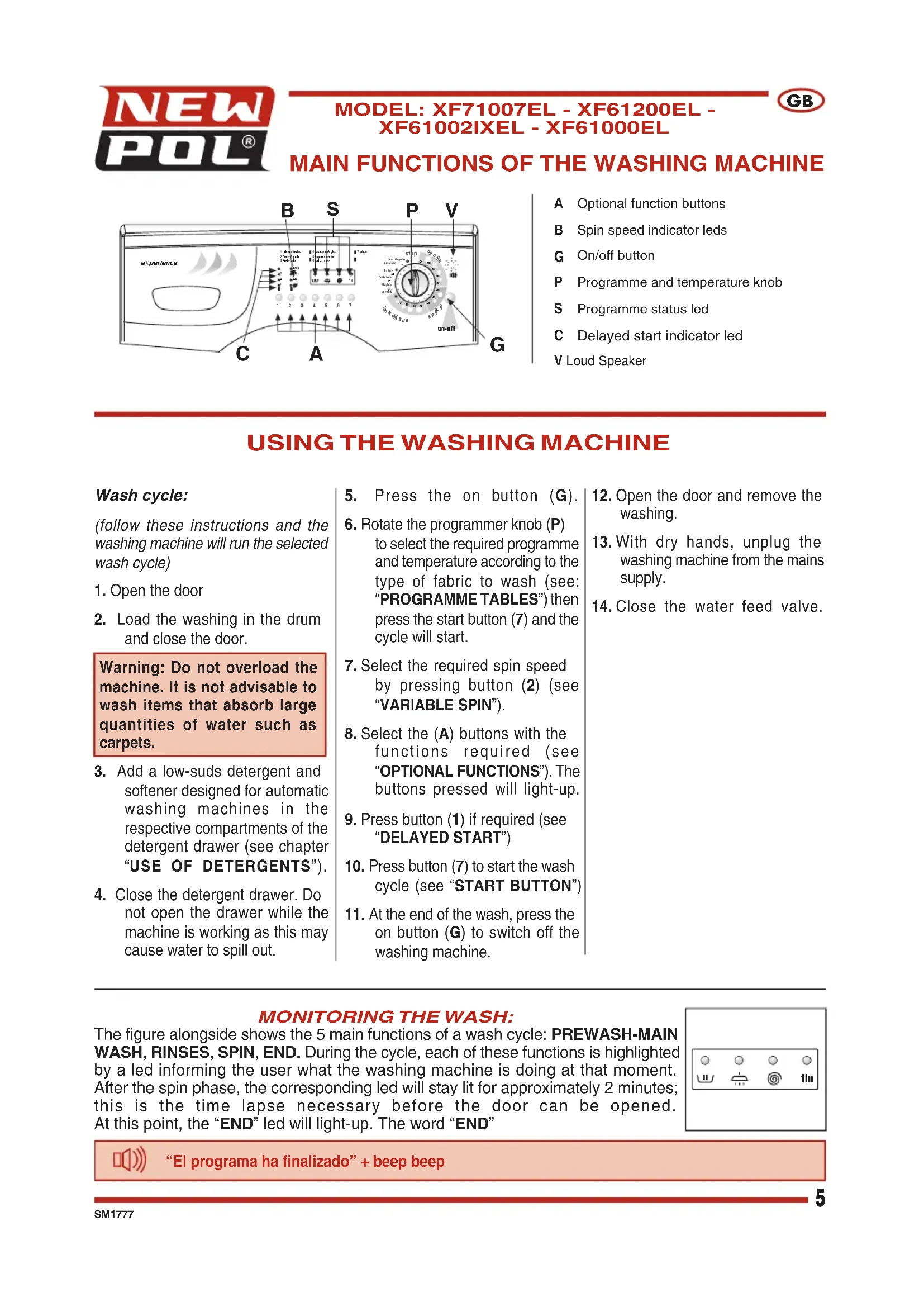 6. Rotate the programmer knob (P)to select the required programmeand temperature according to thetype of fabric to wash (see:“PROGRAMME TABLES”) then press the start button (7) and thecycle will start.7. Select the required spin speedby pressing button (2) (see“VARIABLE SPIN”).8. Select the (A) buttons with thefunctions required (see“OPTIONAL FUNCTIONS”). Thebuttons pressed will light-up.9. Press button (1) if required (see“DELAYED START”)10. Press button (7) to start the washcycle (see “START BUTTON”)11. At the end of the wash, press theon button (G) to switch off thewashing machine.12. Open the door and remove thewashing.13. With dry hands, unplug thewashing machine from the mainssupply.14. Close the water feed valve. finThe machine offers a wide selection of spin speeds that can be selected beforehand according to the wash programme. To change the spin speed, simply press button ( 2 ) to select the required speed. The corresponding speed led will light-up each time the button is pressed. To exclude the spin, select the led corresponding to symbol , if present, or the writing “no-spin”. N.B. the maximum spin speed will vary according to the model and is indicated by the Leds on the machine. The maximum spin speed that can be selected for each programme is SM1777