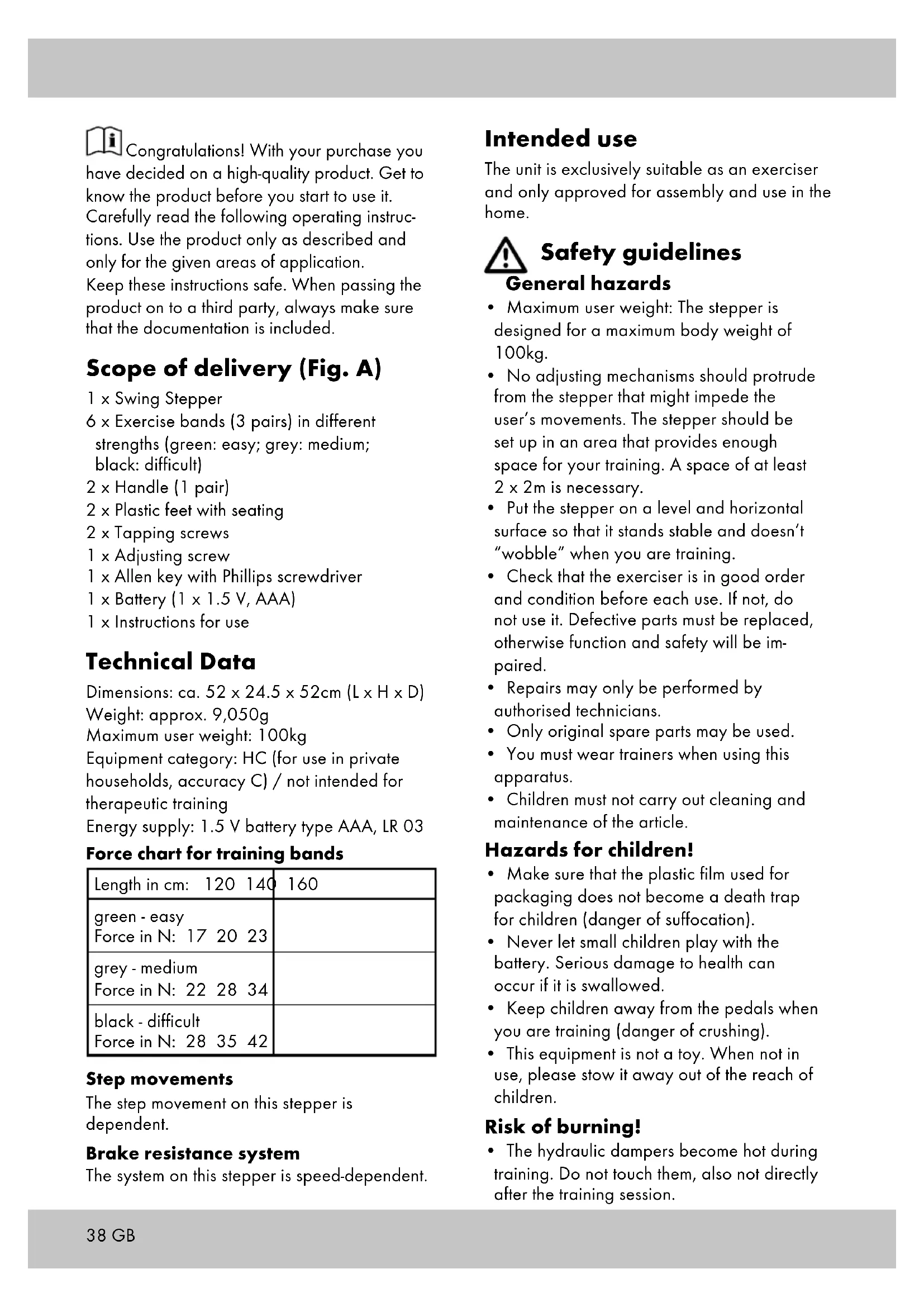 - The hydraulic dampers become hot during training. Do not touch them, also not directly after the training session. Congratulations! With your purchase you have decided on a high-quality product. Get to know the product before you start to use it. Carefully read the following operating instruc- tions. Use the product only as described and only for the given areas of application. Keep these instructions safe. When passing the product on to a third party, always make sure that the documentation is included. Scope of delivery (Fig. A) 1 x Swing Stepper 6 x Exercise bands (3 pairs) in different strengths (green: easy; grey: medium; black: difficult) 2 x Handle (1 pair) 2 x Plastic feet with seating 2 x Tapping screws 1 x Adjusting screw 1 x Allen key with Phillips screwdriver 1 x Battery (1 x 1.5 V, AAA) 1 x Instructions for use Technical Data Dimensions: ca. 52 x 24.5 x 52cm (L x H x D) Weight: approx. 9,050g Maximum user weight: 100kg Equipment category: HC (for use in private households, accuracy C) / not intended for therapeutic training Energy supply: 1.5 V battery type AAA, LR 03 Force chart for training bands Length in cm: 120 140 160 green - easy Force in N: 17 20 23 grey - medium Force in N: 22 28 34 black - difficult Force in N: 28 35 42 Step movements The step movement on this stepper is dependent. Brake resistance system The system on this stepper is speed-dependent.39GB Step 3: Remove the computer from the stepper, by pulling it upwards. Place the supplied battery in the compartment in the underside of the compu- ter. Observe correct polarity. Connect the computer to the plug of the housing and place the computer back into the stepper. Make sure that the cables do not get caught. Step 4: Decide which pull strength you wish to use and attach the handles to the appropriate exercise bands. Attach the metal hooks to the loop on the stepper frame and screw the fastening on the hook tight (Fig. D). Before each training session, check that the bands are securely attached and the hook is screwed shut. Attention! The loops are exclusively designed for upward pulls and must not be stressed trans- versely. This could cause damage to the stepper or injury to the user. Should you wish to train without the bands, re- move the hooks from the loops in order to avoid a trip hazard. Check that all screws and nuts are securely tightened. Operating the computer The stepper complies with the accuracy class C, i.e. no warranty is given for the accuracy of the values displayed by the computer. Switching on and off The computer switches on automatically when you use the pedals and start training. The computer switches off automatically if the stepper is not used for approx. 4 minutes. Display Appears in the upper line: