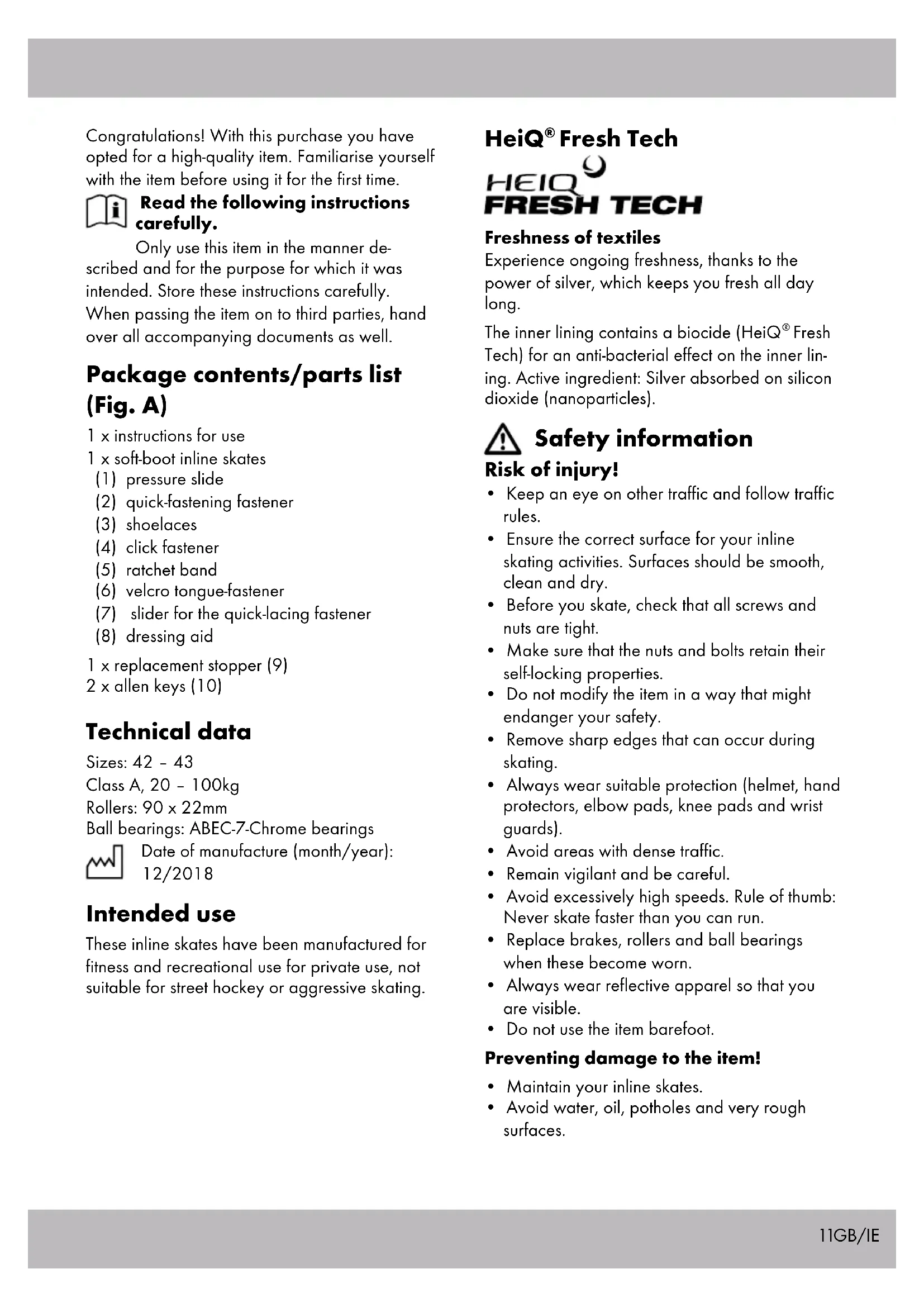 - Avoid water, oil, potholes and very rough surfaces. Congratulations! With this purchase you have opted for a high-quality item. Familiarise yourself with the item before using it for the first time. Read the following instructions carefully. Only use this item in the manner de- scribed and for the purpose for which it was intended. Store these instructions carefully. When passing the item on to third parties, hand over all accompanying documents as well. Package contents/parts list (Fig. A) 1 x instructions for use 1 x soft-boot inline skates (1) pressure slide (2) quick-fastening fastener (3) shoelaces (4) click fastener (5) ratchet band (6) velcro tongue-fastener (7) slider for the quick-lacing fastener (8) dressing aid 1 x replacement stopper (9) 2 x allen keys (10) Technical data Sizes: 42 – 43 Class A, 20 – 100kg Rollers: 90 x 22mm Ball bearings: ABEC-7-Chrome bearings Date of manufacture (month/year): 12/2018 Intended use These inline skates have been manufactured for fitness and recreational use for private use, not suitable for street hockey or aggressive skating.12 GB/IE Tips for skating Note: We recommend skating in skate parks, as well as a skating course with a teacher. Initial training Starting position: Feet shoulder-width, bend your knees slightly to prevent falling backwards. Speeding up: Start with small steps, as a beginner, keeping your feet pointed to the front at an angle. Rolling: If you take a few initial steps, you’ll have enough momentum to place both skates side by side and roll. Bend your knees slightly when doing this. Fall technique Important! Practice falling on your protective gear first without inline skates, on a soft surface. Always try to steer falls forwards, never back- wards! Let yourself fall onto the knee guards. Then brace yourself with elbow and hand guards. Spread your fingers while dong this, to prevent injuries. Mastering bends At low speeds: Spread your weight in the same way as when you ride a bicycle. Spread our weight to your left foot for a left bend, and on your right foot for a right bend. At high speeds: Cross over in the same way as ice-skating (Fig. B). Braking techniques Note: Practice various braking tech- niques on an even surface, with no traf- fic or pedestrians. Prevent falls until you have mastered the braking techniques. Heel braking technique (Fig. C): If your inline skates are equipped with brakes, ensure that you use them. Raise the tip of the skate on which the brake is mounted, lightly apply and press the brake to the ground. Shift your weight slightly forward and bend your knees. The braking effect can be enhanced if you bend your knees more and move your weight further forward while at the same time increasing the pressure on your braking skate. T-Brake (Fig. D): If your inline skates are not equipped with a brake or you have dismounted the brake, we recommend the use of the “T-Stop-Technology” - however, this is only suitable for advanced skat- ers! When using the “T-Stop technology”, you shift your entire weight on one foot. Now move the other foot behind the first one and place it behind it at right angles. Then shift your weight from the front to the inside of the rollers of your rear skate and brake with increasing pressure. Putting skates on Preparing for tightening from the factory setting Important! Make sure that your inline skates fit properly/correctly. The outer boot should not deform when the quick-re- lease fastener is closed. Don’t close the quick-release fastener with force.