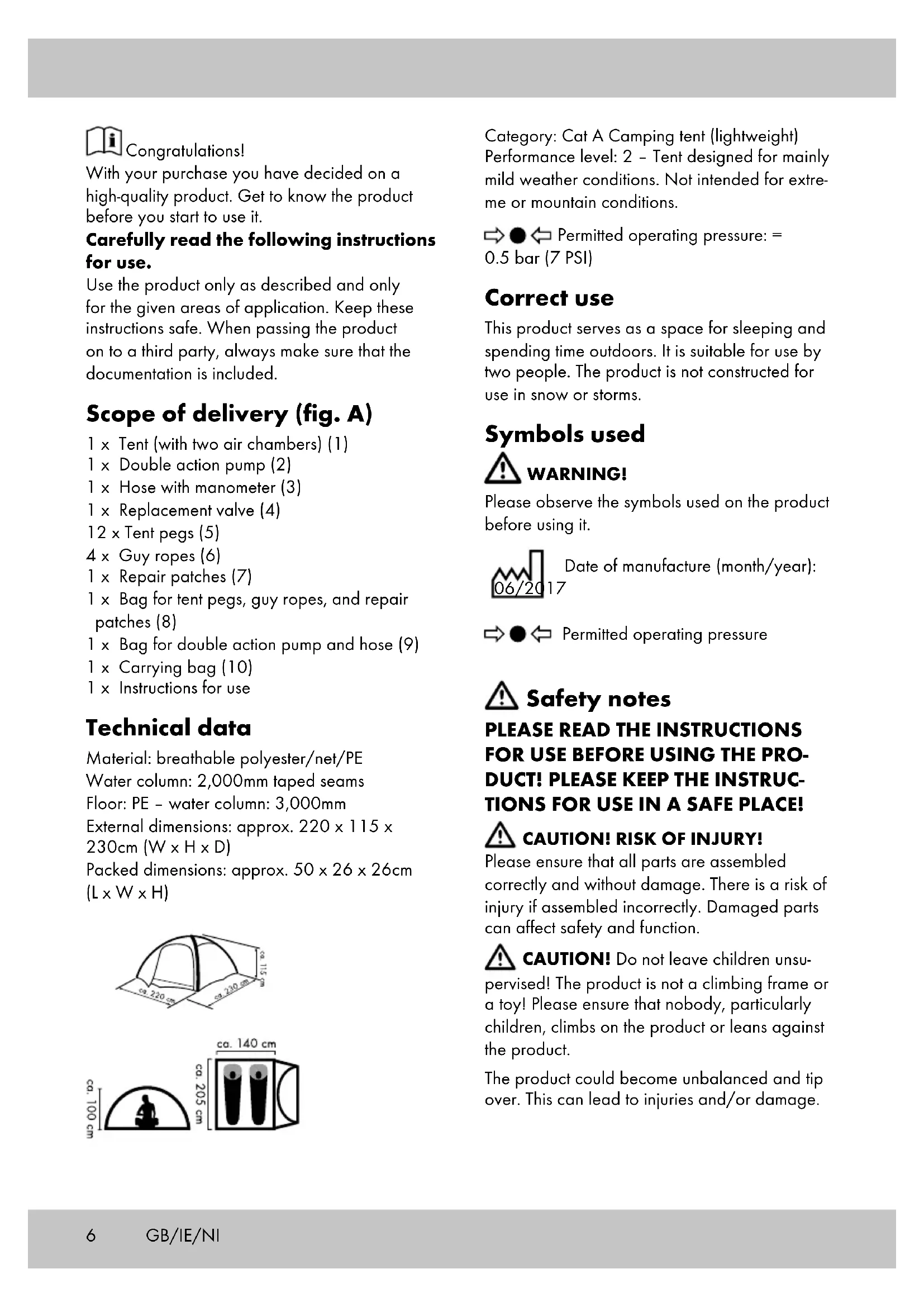 Correct use This product serves as a space for sleeping and spending time outdoors. It is suitable for use by two people. The product is not constructed for use in snow or storms. Symbols used WARNING! Please observe the symbols used on the product before using it. Date of manufacture (month/year): 06/2017 Permitted operating pressure Safety notes